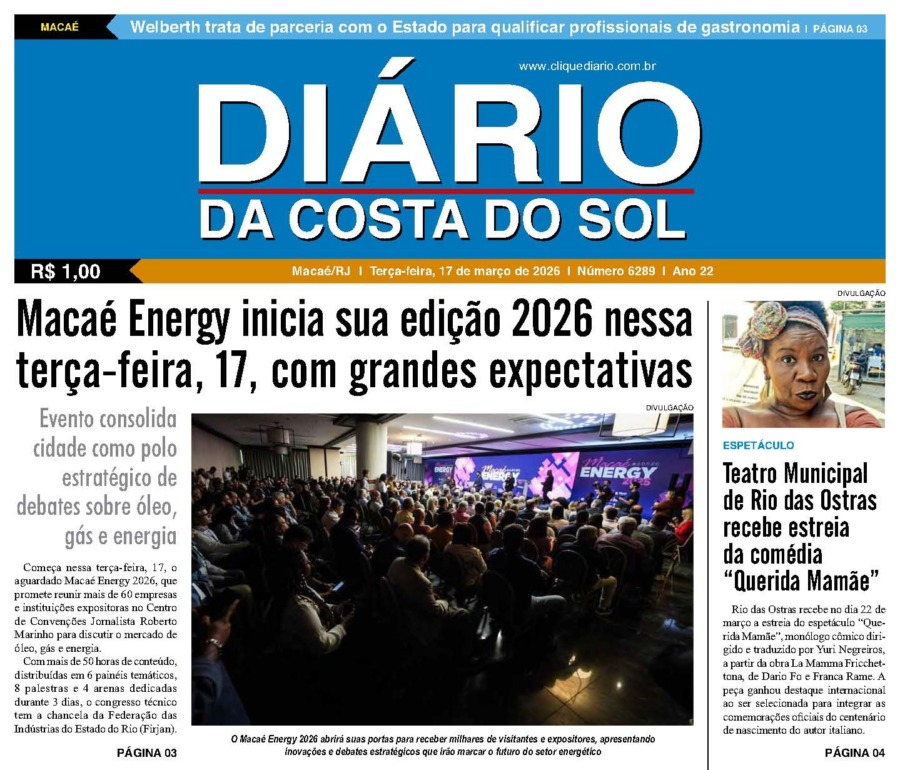Edições Impressas Edição de terça-feira 17/03/2026 nº 6289 Publicado em 17/03/2026 - 08:00 Escrito por Redação Notícias relacionadas: Anterior Edição de sábado a segunda-feira 14 a 16/03/2026 nº 6288 Redação Notícias Recentes Edições Impressas19 minutos atrás Edição de terça-feira 17/03/2026 nº 6289 Armação dos Búzios15 horas atrás Ação social reúne serviços estaduais e municipais e beneficia centenas de moradores em Búzios Cabo Frio15 horas atrás Competição de jiu-jitsu em Cabo Frio mobiliza atletas mirins e arrecada 569 quilos de alimentos Cabo Frio15 horas atrás Portal e-gov reúne serviços digitais e facilita acesso ao comprovante de rendimentos em Cabo Frio Economia16 horas atrás Reunião discute parceria entre Macaé e o Estado visando qualificação profissional Economia17 horas atrás Macaé Energy 2026 começa nessa terça-feira, 17, no Centro de Convenções Cabo Frio18 horas atrás Cabo Frio celebra legado de Teixeira e Sousa com atividades em diversos espaços da cidade São Pedro da Aldeia18 horas atrás Polícia Civil investiga caso de tentativa de estupro após corrida por aplicativo na Região dos Lagos Cabo Frio18 horas atrás Mar agitado arrasta pescador nas pedras da Praia das Conchas e mobiliza resgate em Cabo Frio Cabo Frio18 horas atrás Unidades de saúde de Cabo Frio passam a oferecer DIU e implante hormonal pelo SUS Clique Diário E. L. Mídia Editora Ltda CNPJ: 09.298.880/0001-07 Redação: Rua Tupinambás 122 Gloria – Macaé/RJ comercial@diariocs.com (22) 2765-7353 (22) 999253130 Mais lidas da semana Cidades5 dias atrás Welberth reforça importância do diálogo com instituições em solenidade na OAB de Macaé Edições Impressas5 dias atrás Edição de quinta-feira 12/03/2026 nº 6286 Infraestrutura7 dias atrás Presidente da Cedae promete reduzir pela metade tempo das obras em bairro de Macaé Infraestrutura7 dias atrás Arteris assina aditivo e promete investimentos de R$ 6,2 bilhões na BR-101