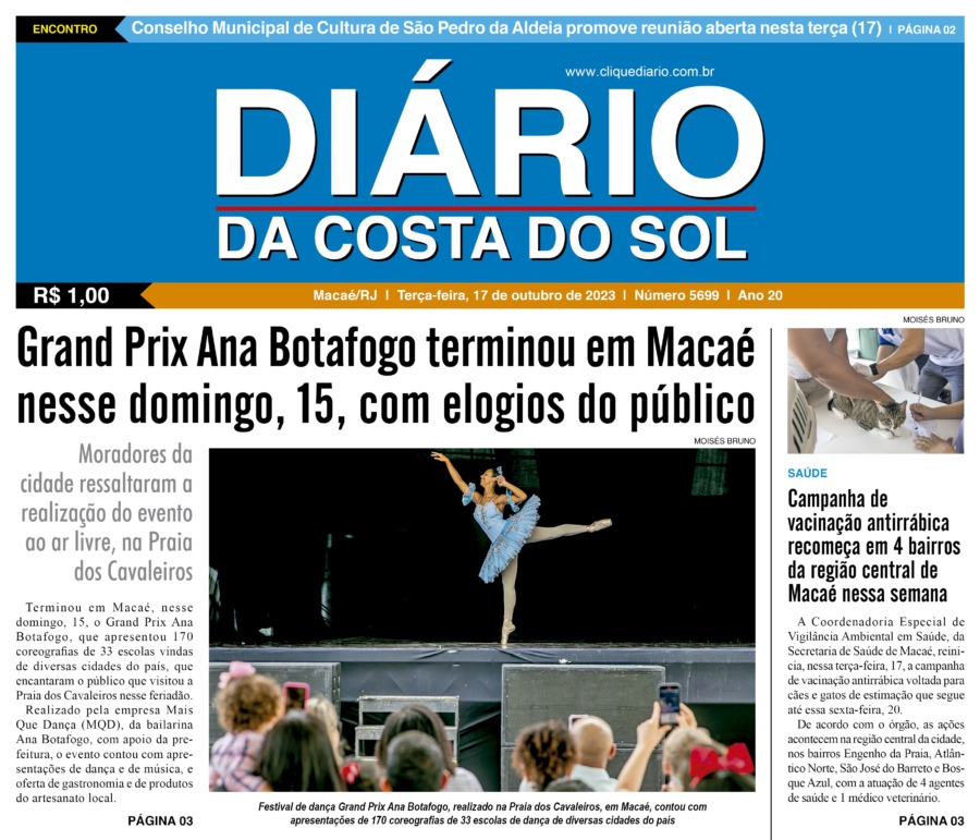 Edições Impressas Edição de terça-feira 17/10/2023 nº 5699 Publicado em 16/10/2023 - 23:55 Escrito por Redação Notícias relacionadas: Seguinte Edição de quarta-feira 18/10/2023 nº 5700 Anterior Edição de quinta a segunda-feira 12 a 16/10/2023 nº 5698 Redação Notícias Recentes Cultura15 horas atrás Rio das Ostras tem 2 cineclubes selecionados para 2ª Mostra Mercosul Audiovisual Cidades15 horas atrás Câmara de Macaé debate aumento de acidentes e propõe Semana de Prevenção a Acidentes com Motociclistas Arraial do cabo15 horas atrás Instituto de Previdência de Arraial do Cabo aplica provas objetivas neste domingo (2) Cidades15 horas atrás Quissamã é destaque nacional ao integrar rede de inovação em Atenção Primária à Saúde da Fiocruz Cabo Frio16 horas atrás Cabo Frio inicia obra de reestruturação na Praça São Benedito para melhorar mobilidade e segurança Cabo Frio16 horas atrás Obra na Rua dos Biquínis marca nova fase de valorização dos espaços públicos em Cabo Frio Polícia16 horas atrás Mulher é morta a tiros enquanto carregava bebê no colo em Campos Armação dos Búzios16 horas atrás Búzios sedia Encontro Fluminense FBHA com foco no fortalecimento do turismo regional Cultura16 horas atrás Festival de Frutos do Mar de Rio das Ostras é lançado em evento para convidados Mobilidade17 horas atrás Acidente assusta moradores e deixa RJ-106 interditada em Saquarema Clique Diário E. L. Mídia Editora Ltda CNPJ: 09.298.880/0001-07 Redação: Rua Tupinambás 122 Gloria – Macaé/RJ comercial@diariocs.com (22) 2765-7353 (22) 999253130 Mais lidas da semana Edições Impressas4 dias atrás Edição de sábado a segunda-feira 25 a 27/10/2025 nº 6198 Edições Impressas6 dias atrás Edição de quinta-feira 23/10/2025 nº 6196 Edições Impressas5 dias atrás Edição de sexta-feira 24/10/2025 nº 6197 Cidades5 dias atrás Macaé Cup vai agitar a serra com o maior torneio de futebol infantil da região