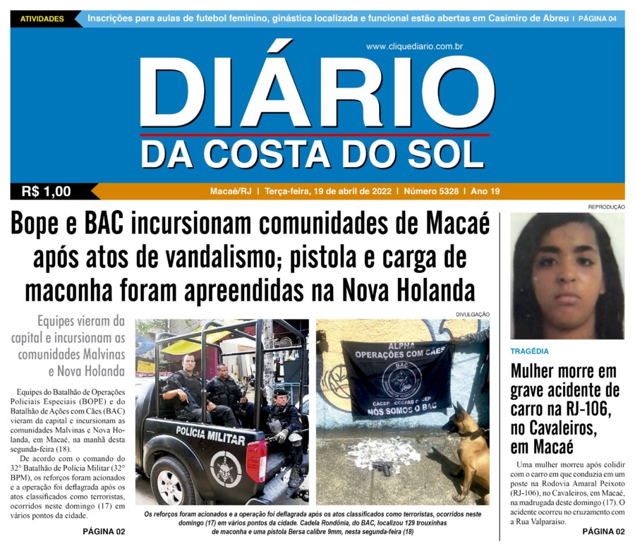Edições Impressas Edição de terça-feira 19/04/2022 nº 5328 Publicado em 18/04/2022 - 23:55 Escrito por Fernando Vitor Notícias relacionadas: Seguinte Edição de quarta-feira 20/04/2022 nº 5329 Anterior Edição de sexta a segunda-feira 15 a 18/04/2022 nº 5327 Fernando Vitor Notícias Recentes Cabo Frio11 horas atrás Evento em Cabo Frio reforça acolhimento e combate ao estigma da estomia Cidades12 horas atrás Rio das Ostras confirma sua X Conferência de Planejamento e Orçamento Participativo Arraial do cabo12 horas atrás Arraial do Cabo vive dias de casa cheia e forte impacto econômico Cidades12 horas atrás Macaé avança com montagem do Natal Magia e das Águas Dançantes Cidades12 horas atrás Quissamã celebra Semana da Consciência Negra com Festival no Quilombo Machadinha Cabo Frio12 horas atrás Cabo Frio destaca protagonismo feminino no lançamento da Revista Mulheres Negras Oportunidade13 horas atrás Rio das Ostras tem alta na oferta de vagas no Banco de Empregos nessa reta final de ano Polícia13 horas atrás Mulher acusa policial militar de agressão em Campos Saúde13 horas atrás Corrida Azul movimenta ruas de Silva Jardim e reforça cuidados com a saúde do homem Desenvolvimento15 horas atrás Maricá assina acordo com empresa chinesa para fabricação de tratores para a agricultura familiar Clique Diário E. L. Mídia Editora Ltda CNPJ: 09.298.880/0001-07 Redação: Rua Tupinambás 122 Gloria – Macaé/RJ comercial@diariocs.com (22) 2765-7353 (22) 999253130 Mais lidas da semana Cabo Frio5 dias atrás Cabo Frio promove ação do projeto Capoeiragem para registro de documentário Desenvolvimento5 dias atrás Rio das Ostras estreita relações com a Rede Petro BC de olho em eventos do setor de energia em 2026 Cultura6 dias atrás Moda e Prosa Caipira tem sua 6ª edição nessa quinta, 20, em Saquarema Cidades6 dias atrás Caravana de Natal Coca-Cola passa por Rio das Ostras e Casimiro de Abreu nessa quinta, 20