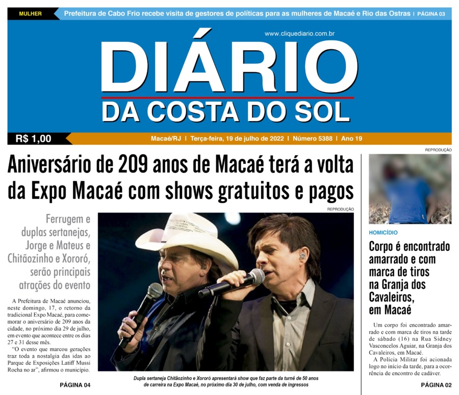 Edições Impressas Edição de terça-feira 19/07/2022 nº 5388 Publicado em 18/07/2022 - 23:55 Escrito por Fernando Vitor Notícias relacionadas: Seguinte Edição de quarta-feira 20/07/2022 nº 5389 Anterior Edição de sábado a segunda-feira 16 a 18/07/2022 nº 5387 Fernando Vitor Notícias Recentes Cultura6 horas atrás Festa do Feijão começa nessa sexta-feira, 21, em Cantagalo, em Rio das Ostras Cidades6 horas atrás Quissamã celebra Consciência Negra com atividades culturais em escolas municipais Polícia7 horas atrás Mulher é presa em Campos acusada de maus-tratos contra a própria filha Arraial do cabo7 horas atrás Arraial do Cabo destaca cultura negra com apresentação de Luciana Mello e Mart’nália Arraial do cabo7 horas atrás Arraial do Cabo inicia checagem obrigatória de veículos de passeio Esporte7 horas atrás Ex-levantadora da seleção brasileira de vôlei é destaque em torneio master em Saquarema Arraial do cabo8 horas atrás Arraial do Cabo amplia ações de equidade racial na saúde pública Arraial do cabo8 horas atrás Arraial do Cabo ajusta protocolos com a Marinha para ampliar segurança nas praias Cidades11 horas atrás Show de fogos, luzes e cores abre programação do Natal em Silva Jardim Polícia11 horas atrás Homem é preso em Rio das Ostras por conduzir moto sem capacete e sem CNH Clique Diário E. L. Mídia Editora Ltda CNPJ: 09.298.880/0001-07 Redação: Rua Tupinambás 122 Gloria – Macaé/RJ comercial@diariocs.com (22) 2765-7353 (22) 999253130 Mais lidas da semana Desenvolvimento2 dias atrás Rio das Ostras estreita relações com a Rede Petro BC de olho em eventos do setor de energia em 2026 Cabo Frio1 dia atrás Cabo Frio promove ação do projeto Capoeiragem para registro de documentário Cultura2 dias atrás Moda e Prosa Caipira tem sua 6ª edição nessa quinta, 20, em Saquarema Meio Ambiente4 dias atrás Lagoa de Iriry, em Rio das Ostras, recebe nova sinalização focada em sustentabilidade
