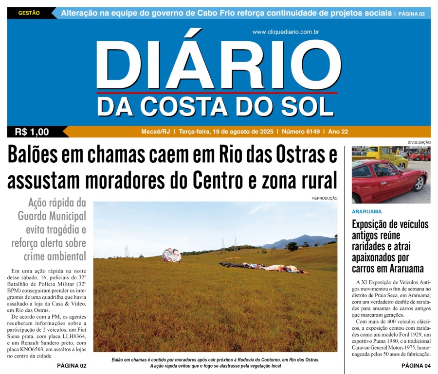 Edições Impressas Edição de terça-feira 19/08/2025 nº 6149 Publicado em 19/08/2025 - 09:26 Escrito por Redação Notícias relacionadas: Seguinte Edição de quarta-feira 20/08/2025 nº 6150 Anterior Edição de sábado a segunda-feira 16 a 18/08/2025 nº 6148 Redação Notícias Recentes Cabo Frio2 dias atrás Estudantes de Cabo Frio brilham em premiação do projeto CaptaAção Meio Ambiente2 dias atrás Cepro promove encontro para discutir avanços e desafios da justiça climática em Rio das Ostras Armação dos Búzios2 dias atrás Búzios Swim celebra esporte, natureza e turismo na Região dos Lagos Cabo Frio2 dias atrás Educação pública de Cabo Frio colhe frutos com conquistas em competições científicas Edições Impressas2 dias atrás Edição de sábado a segunda-feira 08 a 10/11/2025 nº 6208 Polícia2 dias atrás Moto sem placa é abandonada após fuga de suspeito em Macaé Polícia2 dias atrás Polícia Civil prende homem em flagrante por tráfico de drogas no Parque Aeroporto, em Macaé Iguaba3 dias atrás Menina de Iguaba Grande realiza sonho e conhece o príncipe William no Rio de Janeiro Arraial do cabo3 dias atrás Arraial do Cabo é exemplo de tranquilidade na Região dos Lagos, segundo dados do ISP Arraial do cabo3 dias atrás Festival em Arraial do Cabo promete recorde de público com mais de 15 mil pratos e 10 mil litros de chope Clique Diário E. L. Mídia Editora Ltda CNPJ: 09.298.880/0001-07 Redação: Rua Tupinambás 122 Gloria – Macaé/RJ comercial@diariocs.com (22) 2765-7353 (22) 999253130 Mais lidas da semana Arraial do cabo4 dias atrás Arraial do Cabo celebra 3ª edição do Festival de Frutos do Mar com entrada livre; Carol Biazin, Ramona Rox, Liah Soares e mais Meio Ambiente5 dias atrás Programa do governo estadual promove limpeza de rio no Âncora, em Rio das Ostras Meio Ambiente4 dias atrás Ações do Programa Limpa Rio seguem em vários pontos de Rio das Ostras Cidades6 dias atrás HFM ganha novo Pronto-Socorro moderno e ampliado em Campos