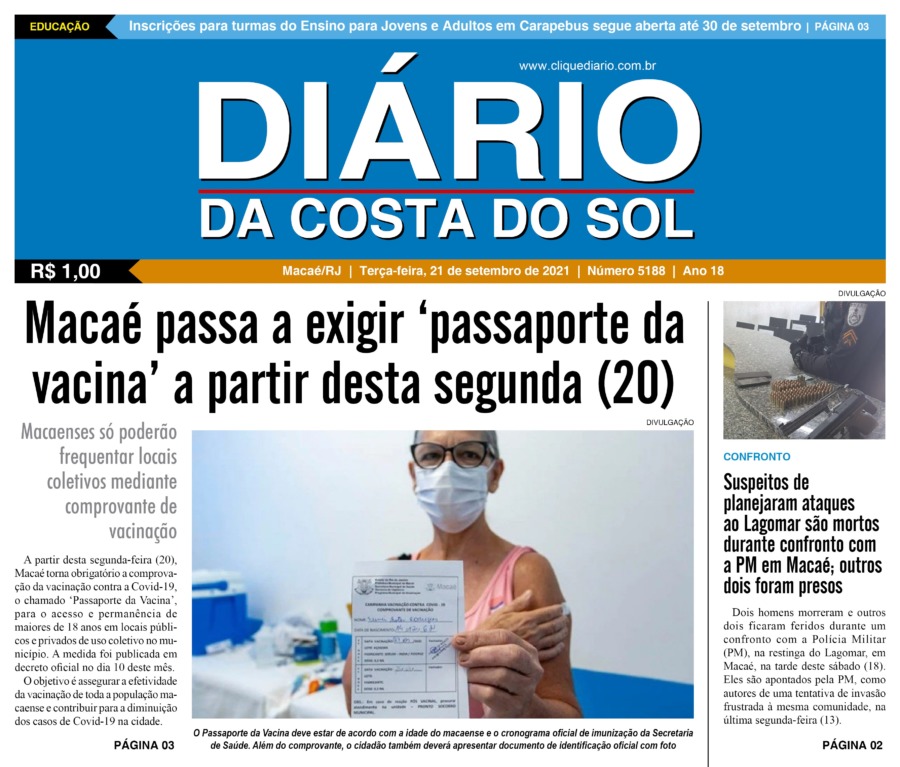 Edições Impressas Edição de terça-feira 21/09/2021 n° 5188 Publicado em 21/09/2021 - 00:08 Escrito por Fernando Vitor Notícias relacionadas: Seguinte Edição de quarta-feira 22/09/2021 n° 5189 Anterior Edição de sábado a segunda-feira 18 a 20/09/2021 n° 5187 Fernando Vitor Notícias Recentes Armação dos Búzios13 horas atrás Búzios atinge 80% de ocupação no feriado Cabo Frio13 horas atrás Cabo Frio prepara esquema especial de segurança nas praias e áreas de lazer Cabo Frio13 horas atrás Cabo Frio realiza ações de proteção a fauna após aparecimento de animais em bairros Cabo Frio14 horas atrás Cabo Frio reúne especialistas em evento do programa “Vim Cuidar de Você” Desenvolvimento14 horas atrás Rio das Ostras estreita relações com a Rede Petro BC de olho em eventos do setor de energia em 2026 Cabo Frio14 horas atrás Aula-passeio apresenta riqueza cultural e ambiental de Cabo Frio na Fazenda Campos Novos Cabo Frio14 horas atrás Cabo Frio suspende expediente em órgãos públicos nesta sexta Cidades14 horas atrás Macaé terá Dia do Futebol Feminino e programa para valorização da mulher rural Arraial do cabo14 horas atrás Carreta científica desembarca em Arraial do Cabo com programação gratuita Polícia14 horas atrás Polícia Civil prende liderança do ADA no bairro Fronteira em Macaé Clique Diário E. L. Mídia Editora Ltda CNPJ: 09.298.880/0001-07 Redação: Rua Tupinambás 122 Gloria – Macaé/RJ comercial@diariocs.com (22) 2765-7353 (22) 999253130 Mais lidas da semana Cultura6 dias atrás Adilson Lopes apresenta exposição “Trajetória” em Casimiro de Abreu Desenvolvimento14 horas atrás Rio das Ostras estreita relações com a Rede Petro BC de olho em eventos do setor de energia em 2026 Cidades3 dias atrás Macaé registra avanço na coleta seletiva porta a porta e recolhe mais de 2 toneladas em 45 dias Mobilidade6 dias atrás Mobilidade promove fiscalização para verificar situação de táxis em Rio das Ostras