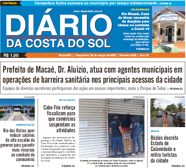 Edições Impressas Edição de terça-feira, 24/03/2020 - 4826 Publicado em 24/03/2020 - 11:53 Escrito por Nunes TI / Tchê Digital Notícias relacionadas:destaque Seguinte Diário da Costa do Sol lança ferramenta para acompanhar edição impressa pela internet Nunes TI / Tchê Digital Notícias Recentes Cultura18 minutos atrás Festival de Frutos do Mar de Rio das Ostras é lançado em evento para convidados Mobilidade1 hora atrás Acidente assusta moradores e deixa RJ-106 interditada em Saquarema Iguaba1 hora atrás Carro despenca em valão e mobiliza equipes de resgate em Iguaba Grande Cabo Frio2 horas atrás Audiência pública discute receitas e despesas previstas para Cabo Frio no próximo ano Cabo Frio2 horas atrás Contribuintes de Cabo Frio podem quitar dívidas ajudando causas sociais Cabo Frio2 horas atrás Evento religioso e cultural reúne fiéis na Semana Evangélica de Cabo Frio Cidades5 horas atrás Sana celebra 123 anos com programação cultural especial Cidades5 horas atrás Silas Andrade brilha e coloca Macaé no pódio da Copa Latino-Americana de BMX Polícia5 horas atrás Furto de celular leva a prisão de um casal em Macaé Cidades5 horas atrás Silva Jardim segue o Estado e transfere ponto facultativo para sexta, 31 Clique Diário E. L. Mídia Editora Ltda CNPJ: 09.298.880/0001-07 Redação: Rua Tupinambás 122 Gloria – Macaé/RJ comercial@diariocs.com (22) 2765-7353 (22) 999253130 Mais lidas da semana Edições Impressas3 dias atrás Edição de sábado a segunda-feira 25 a 27/10/2025 nº 6198 Edições Impressas6 dias atrás Edição de quarta-feira 22/10/2025 nº 6195 Cidadania4 dias atrás Plano Diretor de Rio das Ostras é tema de fórum da sociedade civil nesse sábado, 25 Cidades4 dias atrás Macaé Cup vai agitar a serra com o maior torneio de futebol infantil da região