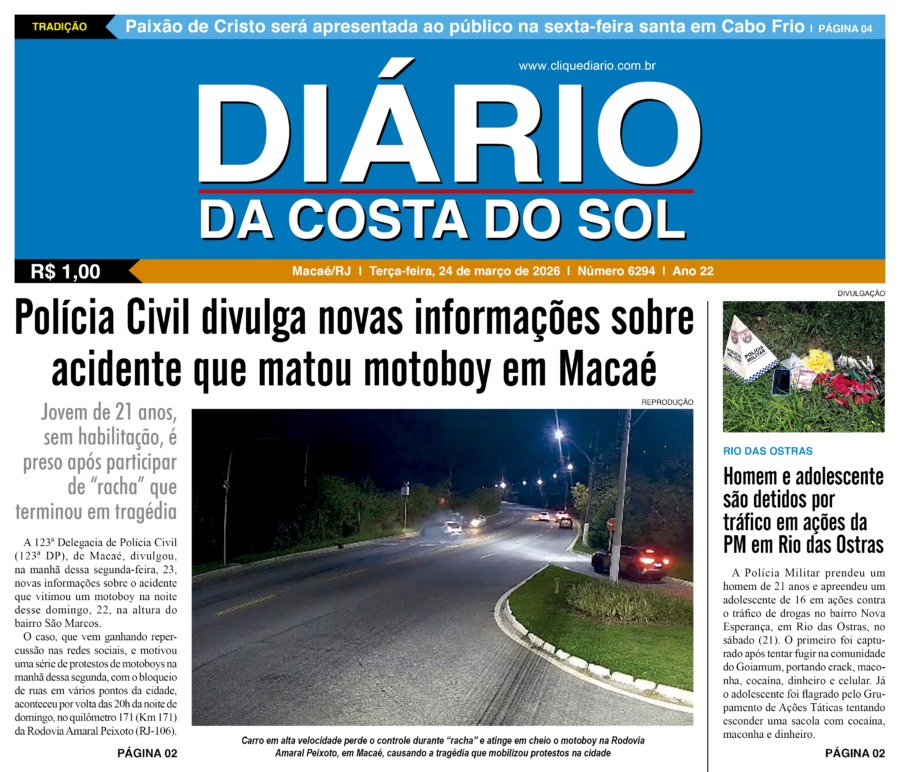 Edições Impressas Edição de terça-feira 24/03/2026 nº 6294 Publicado em 24/03/2026 - 09:12 Escrito por Redação Notícias relacionadas: Anterior Edição de sábado a segunda-feira 21 a 23/03/2026 nº 6293 Redação Notícias Recentes Polícia37 minutos atrás Polícia Civil prende o 2º motorista envolvido no acidente que matou motoboy em Macaé Polícia1 hora atrás Criminoso foragido da Justiça é preso pela Polícia Civil no centro de Macaé Edições Impressas2 horas atrás Edição de terça-feira 24/03/2026 nº 6294 Armação dos Búzios19 horas atrás Nova unidade do Café do Trabalhador começa a funcionar nesta terça-feira em Búzios São Pedro da Aldeia19 horas atrás Atendimento via WhatsApp agiliza orientação ao consumidor em São Pedro da Aldeia Arraial do cabo19 horas atrás MaLu é anunciada como destaque inicial do tradicional evento gastronômico de Arraial do Cabo Política19 horas atrás Macaé inicia revisão do Plano Diretor com evento na Câmara nessa terça-feira, 24 Arraial do cabo19 horas atrás Relíquias sobre rodas são destaque em programação cultural no fim de semana em Arraial do Cabo Cabo Frio20 horas atrás Paixão de Cristo será apresentada ao público na sexta-feira santa em Cabo Frio Cabo Frio20 horas atrás Secretaria de Educação de Cabo Frio anuncia nova convocação para cadastro reserva de motoristas Clique Diário E. L. Mídia Editora Ltda CNPJ: 09.298.880/0001-07 Redação: Rua Tupinambás 122 Gloria – Macaé/RJ comercial@diariocs.com (22) 2765-7353 (22) 999253130 Mais lidas da semana Polícia4 dias atrás Mais um adolescente é detido em Rio das Ostras por envolvimento com o tráfico Edições Impressas4 dias atrás Edição de sexta-feira 20/03/2026 nº 6292 Edições Impressas5 dias atrás Edição de quinta-feira 19/03/2026 nº 6291 Polícia24 horas atrás Polícia Civil divulga novas informações sobre acidente que matou motoboy em Macaé