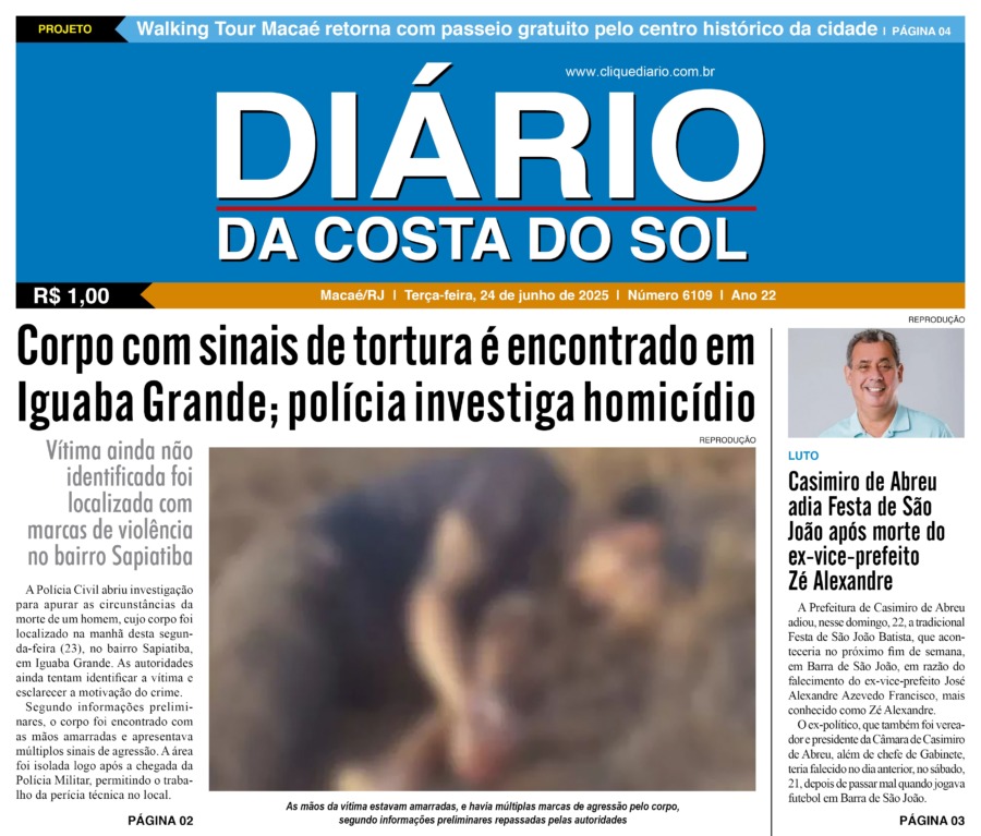 Edições Impressas Edição de terça-feira 24/06/2025 nº 6109 Publicado em 24/06/2025 - 09:35 Escrito por Redação Notícias relacionadas: Seguinte Edição de quarta-feira 25/06/2025 nº 6110 Anterior Edição de quinta a segunda-feira 19 a 23/06/2025 nº 6108 Redação Notícias Recentes Cabo Frio6 horas atrás Reforma marca nova fase para o esporte cabo-friense e aniversário da cidade Arraial do cabo6 horas atrás Fórum de Arraial propõe novo modelo de desenvolvimento baseado nos 3Ds; Desvincular, Descarbonizar e Descontaminar Saúde7 horas atrás Saúde de Rio das Ostras promove mutirão de cirurgia pediátrica nessa semana Cidades7 horas atrás Guarda Ambiental resgata jiboia de três metros em área urbana de Macaé Cidades7 horas atrás Vereadores de Macaé vão embarcar nesta quinta para participar da COP 30 em Belém Arraial do cabo7 horas atrás Parceria com a PF fortalece preparo técnico da Segurança Pública de Arraial do Cabo Arraial do cabo7 horas atrás Iniciativa busca compensar emissões de carbono da frota de Arraial Cidades8 horas atrás Parceria com o Estado reforça prevenção de enchentes em Rio das Ostras há 39 dias do verão Desenvolvimento8 horas atrás Arteris vence novo leilão da BR-101 e mantém operação da via até 2047 Cidades8 horas atrás Prefeitura de Quissamã abre prazo para solicitação de isenção do IPTU 2026 e 2027 Clique Diário E. L. Mídia Editora Ltda CNPJ: 09.298.880/0001-07 Redação: Rua Tupinambás 122 Gloria – Macaé/RJ comercial@diariocs.com (22) 2765-7353 (22) 999253130 Mais lidas da semana Arraial do cabo6 dias atrás Arraial do Cabo celebra 3ª edição do Festival de Frutos do Mar com entrada livre; Carol Biazin, Ramona Rox, Liah Soares e mais Meio Ambiente6 dias atrás Ações do Programa Limpa Rio seguem em vários pontos de Rio das Ostras Cabo Frio6 dias atrás Música, poesia e memória celebram os 410 anos de Cabo Frio Polícia13 horas atrás Farmácia é interditada e uma pessoa é presa em Rio das Ostras em operação da Polícia Federal