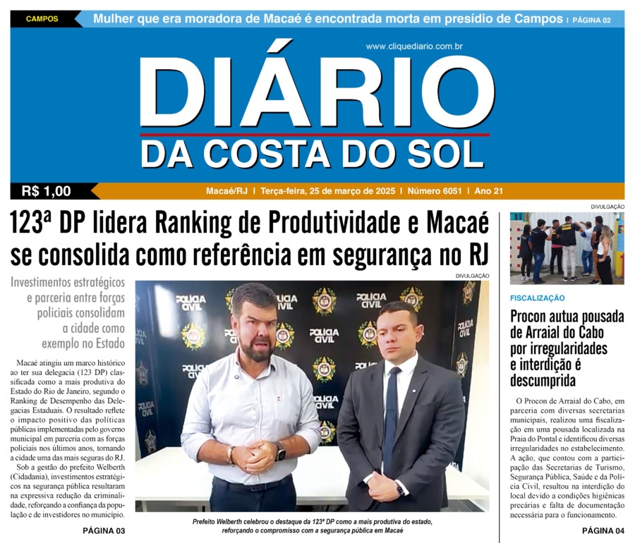 Edições Impressas Edição de terça-feira 25/03/2025 nº 6051 Publicado em 25/03/2025 - 08:25 Escrito por Redação Notícias relacionadas: Seguinte Edição de quarta-feira 26/03/2025 nº 6052 Anterior Edição de sábado a segunda-feira, 22 a 24/03/2025 nº 6050 Redação Notícias Recentes Iguaba16 horas atrás Menina de Iguaba Grande realiza sonho e conhece o príncipe William no Rio de Janeiro Arraial do cabo16 horas atrás Arraial do Cabo é exemplo de tranquilidade na Região dos Lagos, segundo dados do ISP Arraial do cabo16 horas atrás Festival em Arraial do Cabo promete recorde de público com mais de 15 mil pratos e 10 mil litros de chope Arraial do cabo16 horas atrás Oficina une saúde, cidadania e acolhimento em Arraial do Cabo Arraial do cabo16 horas atrás Sucesso de público marca o primeiro dia da Arraial Expo XP Cabo Frio16 horas atrás Prefeitura de Cabo Frio premia autoras com experiências culturais e incentivo à leitura Cidades17 horas atrás Macaé realiza audiência pública do Projeto Macaé +20 no dia 10 de dezembro Polícia17 horas atrás Polícia Militar recupera celulares roubados após série de assaltos em Campos Educação17 horas atrás Mostra cultural do CIEP Mestre Marçal lota o Teatro de Rio das Ostras Polícia18 horas atrás Polícia prende 3 homens envolvidos com o tráfico em Rio das Ostras Clique Diário E. L. Mídia Editora Ltda CNPJ: 09.298.880/0001-07 Redação: Rua Tupinambás 122 Gloria – Macaé/RJ comercial@diariocs.com (22) 2765-7353 (22) 999253130 Mais lidas da semana Arraial do cabo2 dias atrás Arraial do Cabo celebra 3ª edição do Festival de Frutos do Mar com entrada livre; Carol Biazin, Ramona Rox, Liah Soares e mais Cidades4 dias atrás HFM ganha novo Pronto-Socorro moderno e ampliado em Campos Turismo5 dias atrás Saquarema celebra reconhecimento de projeto pelo Ministério do Turismo Educação4 dias atrás Estudantes de Rio das Ostras são destaques em evento nacional da Educação