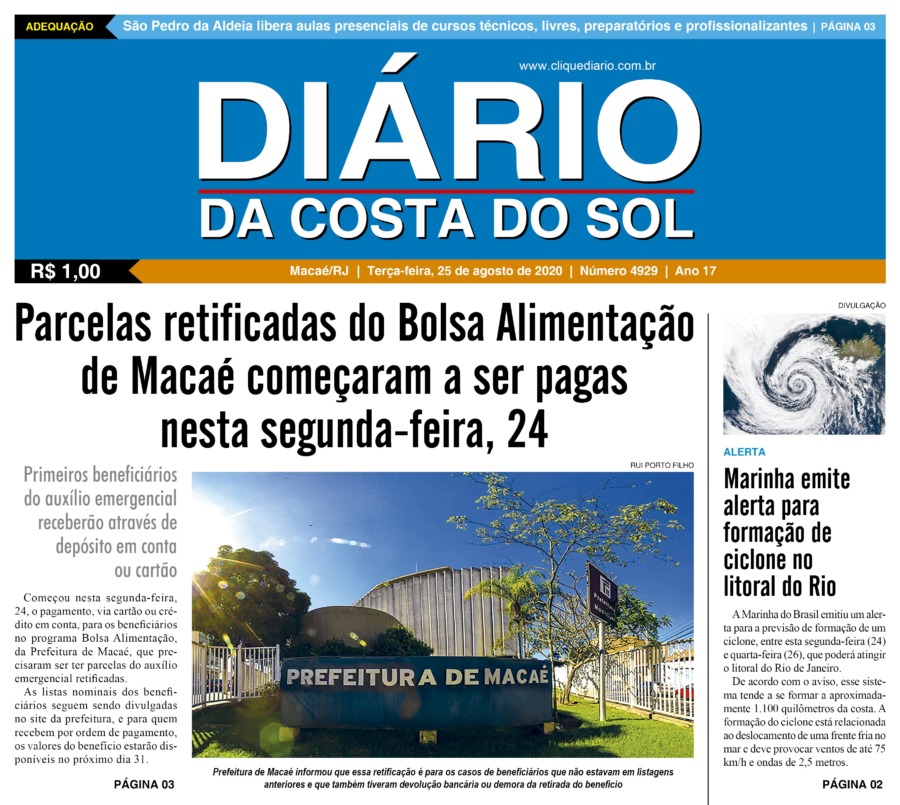 Edições Impressas Edição de terça-feira 25/08/2020 nº 4929 Publicado em 25/08/2020 - 05:00 Escrito por Fernando Vitor Notícias relacionadas:destaque Seguinte Edição de quarta-feira 26/08/2020 nº 4930 Anterior Edição de sábado a segunda-feira 22 a 24/08/2020 nº 4928 Fernando Vitor Notícias Recentes Cabo Frio10 horas atrás Arte e solidariedade marcam a 1ª Mostra de Dança Regional de Tamoios Cidades15 horas atrás Região serrana de Macaé recebe 1º X-Force Passeio de Quadriciclo e Aranha neste domingo (26) Polícia15 horas atrás Polícia apreende mais de meio quilo de drogas no Loteamento São João, em Rio das Ostras Saúde1 dia atrás Eventos esportivo e cultural reforça campanha do Outubro Rosa em Rio das Ostras nesse domingo, 26 Edições Impressas2 dias atrás Sábado a segunda-feira 25 a 27/10/2025 nº 6197 Cidades2 dias atrás Shopping Plaza Macaé oferece programação gratuita com feira de adoção e show de pagode neste fim de semana Cidades2 dias atrás 32º BPM completa 23 anos com solenidade de celebração e reconhecimento aos policiais Armação dos Búzios2 dias atrás Búzios celebra esporte e superação com XC RUN 2025 Araruama2 dias atrás Araruama promove saúde, lazer e cidadania em evento comunitário Arraial do cabo2 dias atrás Educação e sustentabilidade se encontram para jovens de Arraial do Cabo Clique Diário E. L. Mídia Editora Ltda CNPJ: 09.298.880/0001-07 Redação: Rua Tupinambás 122 Gloria – Macaé/RJ comercial@diariocs.com (22) 2765-7353 (22) 999253130 Mais lidas da semana Cultura6 dias atrás Silva Jardim anuncia shows gratuitos de samba e pagode para o fim de semana Cultura6 dias atrás Música, emoção e cores: Rodrigo Pontes apresenta show especial em Rio das Ostras Cabo Frio6 dias atrás Atletas de várias cidades se enfrentam em competição de Muay Thai em Cabo Frio Cabo Frio6 dias atrás Serviços essenciais permanecem ativos durante ponto facultativo em Cabo Frio