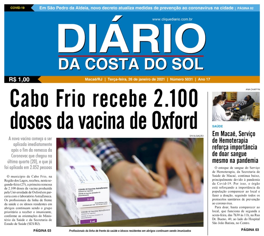 Edições Impressas Edição de terça-feira 26/01/2021 nº 5031 Publicado em 26/01/2021 - 02:32 Escrito por Fernando Vitor Notícias relacionadas:destaque Seguinte Edição de quarta-feira 27/01/2021 nº 5032 Anterior Edição de sábado a segunda-feira 23 a 25/01/2021 nº 5030 Fernando Vitor Notícias Recentes Cabo Frio30 minutos atrás Ação em parceria com o Estado oferece mais de 100 exames por dia em Cabo Frio Cabo Frio46 minutos atrás Cabo Frio identifica material oleoso entre a Ilha do Japonês e a Ponte Deputado Márcio Corrêa Cabo Frio1 hora atrás Unidade móvel de tomografia atende centenas de pacientes em Cabo Frio Cabo Frio2 horas atrás Prefeitura promove edição especial do programa “Cabo Frio 410 anos” Cabo Frio2 horas atrás Cabo Frio realiza nova etapa do mutirão “Canal Limpo” nesta quinta (13) Polícia2 horas atrás Operação da PF cumpre mandados de busca e de prisão em Rio das Ostras Polícia2 horas atrás Polícia realiza operação de combate ao tráfico no Âncora, em Rio das Ostras Polícia3 horas atrás Polícia prende mais 4 por tráfico de drogas na Santa Catarina, em Rio das Ostras Polícia3 horas atrás Polícia Civil prende dupla com carro roubado no bairro Lagomar, em Macaé Cidades4 horas atrás Praia dos Cavaleiros recebe Circuito BB Lagos de Bodyboarding neste fim de semana Clique Diário E. L. Mídia Editora Ltda CNPJ: 09.298.880/0001-07 Redação: Rua Tupinambás 122 Gloria – Macaé/RJ comercial@diariocs.com (22) 2765-7353 (22) 999253130 Mais lidas da semana Arraial do cabo5 dias atrás Arraial do Cabo celebra 3ª edição do Festival de Frutos do Mar com entrada livre; Carol Biazin, Ramona Rox, Liah Soares e mais Meio Ambiente5 dias atrás Ações do Programa Limpa Rio seguem em vários pontos de Rio das Ostras Cidades7 dias atrás HFM ganha novo Pronto-Socorro moderno e ampliado em Campos Meio Ambiente6 dias atrás Programa do governo estadual promove limpeza de rio no Âncora, em Rio das Ostras