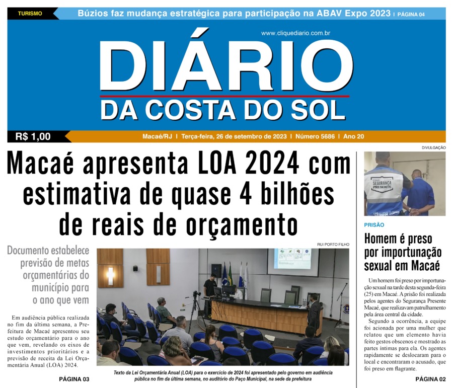 Edições Impressas Edição de terça-feira 26/09/2023 nº 5686 Publicado em 26/09/2023 - 00:00 Escrito por Redação Notícias relacionadas: Seguinte Edição de quarta-feira 27/09/2023 nº 5687 Anterior Edição de sábado a segunda-feira 23 a 25/09/2023 nº 5685 Redação Notícias Recentes Cabo Frio1 dia atrás Estudantes de Cabo Frio brilham em premiação do projeto CaptaAção Meio Ambiente1 dia atrás Cepro promove encontro para discutir avanços e desafios da justiça climática em Rio das Ostras Armação dos Búzios1 dia atrás Búzios Swim celebra esporte, natureza e turismo na Região dos Lagos Cabo Frio1 dia atrás Educação pública de Cabo Frio colhe frutos com conquistas em competições científicas Edições Impressas1 dia atrás Edição de sábado a segunda-feira 08 a 10/11/2025 nº 6208 Polícia1 dia atrás Moto sem placa é abandonada após fuga de suspeito em Macaé Polícia2 dias atrás Polícia Civil prende homem em flagrante por tráfico de drogas no Parque Aeroporto, em Macaé Iguaba2 dias atrás Menina de Iguaba Grande realiza sonho e conhece o príncipe William no Rio de Janeiro Arraial do cabo2 dias atrás Arraial do Cabo é exemplo de tranquilidade na Região dos Lagos, segundo dados do ISP Arraial do cabo2 dias atrás Festival em Arraial do Cabo promete recorde de público com mais de 15 mil pratos e 10 mil litros de chope Clique Diário E. L. Mídia Editora Ltda CNPJ: 09.298.880/0001-07 Redação: Rua Tupinambás 122 Gloria – Macaé/RJ comercial@diariocs.com (22) 2765-7353 (22) 999253130 Mais lidas da semana Arraial do cabo3 dias atrás Arraial do Cabo celebra 3ª edição do Festival de Frutos do Mar com entrada livre; Carol Biazin, Ramona Rox, Liah Soares e mais Meio Ambiente4 dias atrás Programa do governo estadual promove limpeza de rio no Âncora, em Rio das Ostras Meio Ambiente3 dias atrás Ações do Programa Limpa Rio seguem em vários pontos de Rio das Ostras Cidades5 dias atrás HFM ganha novo Pronto-Socorro moderno e ampliado em Campos