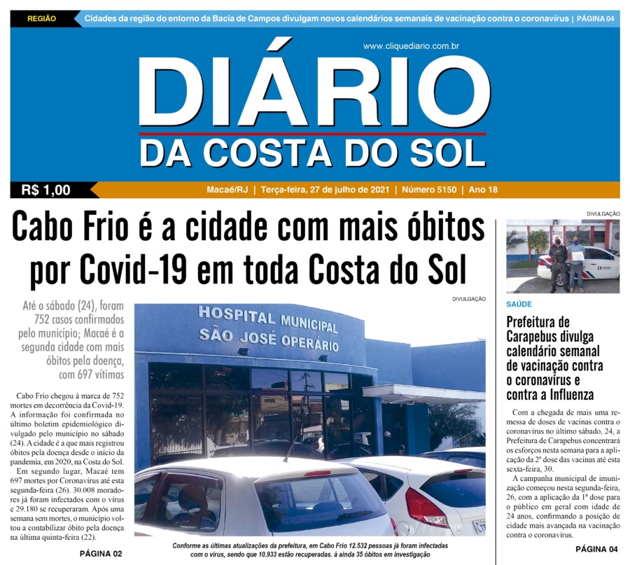 Edições Impressas Edição de terça-feira 27/07/2021 n° 5150 Publicado em 27/07/2021 - 00:09 Escrito por Fernando Vitor Notícias relacionadas: Seguinte Edição de quarta-feira 28/07/2021 n° 5151 Anterior Edição de sábado a segunda-feira 24 a 26/07/2021 n° 5149 Fernando Vitor Notícias Recentes Cidades13 horas atrás Macaé registra avanço na coleta seletiva porta a porta e recolhe mais de 2 toneladas em 45 dias Meio Ambiente13 horas atrás Lagoa de Iriry, em Rio das Ostras, recebe nova sinalização focada em sustentabilidade Araruama13 horas atrás Araruama busca ampliar diálogo sobre saneamento antes de concluir revisão do PMSB Cabo Frio14 horas atrás Câmeras flagram colisão no restaurante Tia maluca seguida de fuga no Centro de Cabo Frio Cabo Frio14 horas atrás Cabo Frio reforça proteção ambiental após depredação na Trilha Translagunar Cabo Frio14 horas atrás Cabo Frio reúne especialistas para debater estratégias de enfrentamento às drogas Polícia14 horas atrás Homem morre e outro fica ferido em ataque a tiros em Travessão, em Campos dos Goytacazes Polícia14 horas atrás Polícia prende 2 homens em operação contra o tráfico de drogas em Rio das Ostras Arraial do cabo15 horas atrás Ação da Guarda Municipal e COMTRANS em Arraial coíbe prática perigosa em área turística Arraial do cabo15 horas atrás Município de Arraial organiza atividade crescente e amplia controle das rotas Clique Diário E. L. Mídia Editora Ltda CNPJ: 09.298.880/0001-07 Redação: Rua Tupinambás 122 Gloria – Macaé/RJ comercial@diariocs.com (22) 2765-7353 (22) 999253130 Mais lidas da semana Cultura4 dias atrás Adilson Lopes apresenta exposição “Trajetória” em Casimiro de Abreu Polícia6 dias atrás Farmácia é interditada e uma pessoa é presa em Rio das Ostras em operação da Polícia Federal Cidades7 dias atrás Servidores de Rio das Ostras participam de treinamento do Estado em Búzios Edições Impressas6 dias atrás Edição de quarta-feira 12/11/2025 nº 6210