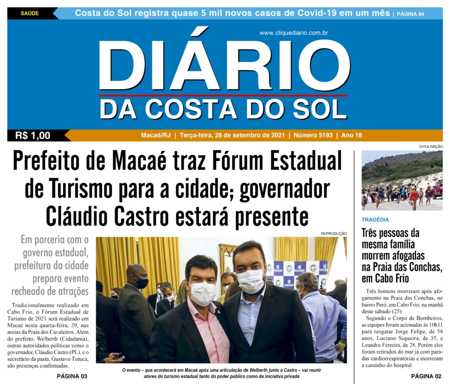 Edições Impressas Edição de terça-feira 28/09/2021 n° 5193 Publicado em 28/09/2021 - 05:23 Escrito por Fernando Vitor Notícias relacionadas: Seguinte Edição de quarta-feira 29/09/2021 n° 5194 Anterior Edição de sábado a segunda-feira 25 a 27/09/2021 n° 5192 Fernando Vitor Notícias Recentes Armação dos Búzios13 horas atrás Búzios atinge 80% de ocupação no feriado Cabo Frio14 horas atrás Cabo Frio prepara esquema especial de segurança nas praias e áreas de lazer Cabo Frio14 horas atrás Cabo Frio realiza ações de proteção a fauna após aparecimento de animais em bairros Cabo Frio14 horas atrás Cabo Frio reúne especialistas em evento do programa “Vim Cuidar de Você” Desenvolvimento14 horas atrás Rio das Ostras estreita relações com a Rede Petro BC de olho em eventos do setor de energia em 2026 Cabo Frio14 horas atrás Aula-passeio apresenta riqueza cultural e ambiental de Cabo Frio na Fazenda Campos Novos Cabo Frio14 horas atrás Cabo Frio suspende expediente em órgãos públicos nesta sexta Cidades14 horas atrás Macaé terá Dia do Futebol Feminino e programa para valorização da mulher rural Arraial do cabo14 horas atrás Carreta científica desembarca em Arraial do Cabo com programação gratuita Polícia14 horas atrás Polícia Civil prende liderança do ADA no bairro Fronteira em Macaé Clique Diário E. L. Mídia Editora Ltda CNPJ: 09.298.880/0001-07 Redação: Rua Tupinambás 122 Gloria – Macaé/RJ comercial@diariocs.com (22) 2765-7353 (22) 999253130 Mais lidas da semana Cultura6 dias atrás Adilson Lopes apresenta exposição “Trajetória” em Casimiro de Abreu Desenvolvimento14 horas atrás Rio das Ostras estreita relações com a Rede Petro BC de olho em eventos do setor de energia em 2026 Cidades3 dias atrás Macaé registra avanço na coleta seletiva porta a porta e recolhe mais de 2 toneladas em 45 dias Mobilidade6 dias atrás Mobilidade promove fiscalização para verificar situação de táxis em Rio das Ostras