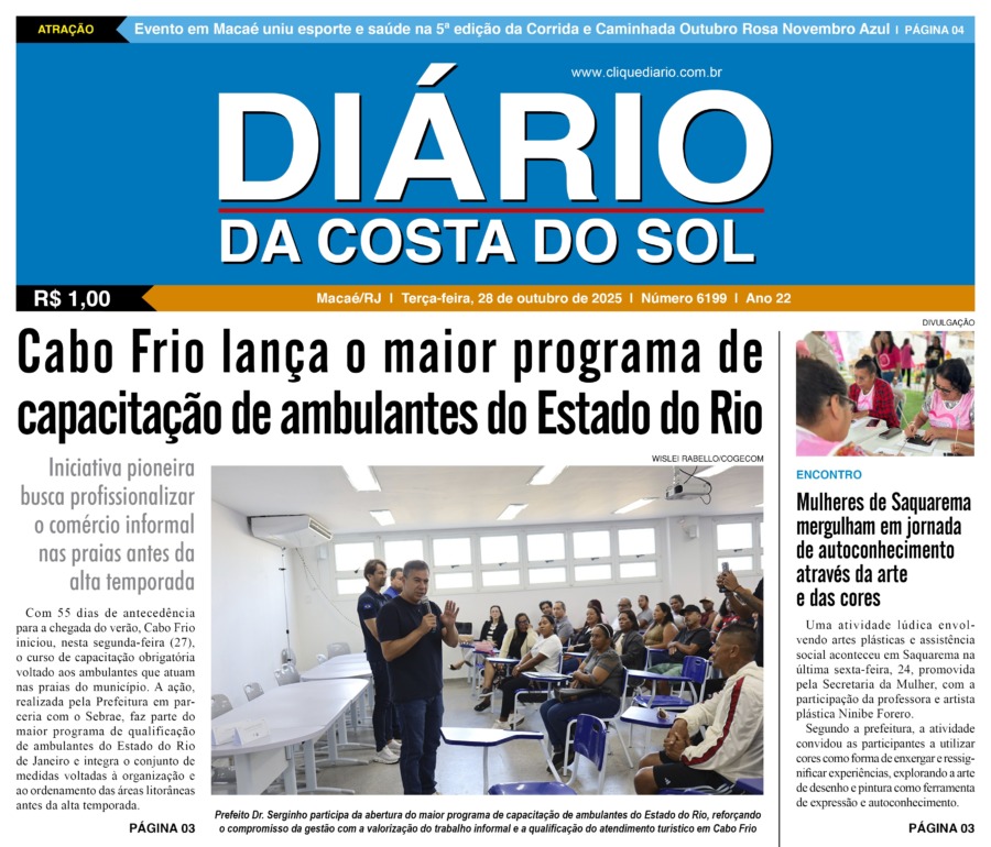 Edições Impressas Edição de terça-feira 28/10/2025 nº 6199 Publicado em 28/10/2025 - 09:26 Escrito por Redação Notícias relacionadas: Anterior Edição de sábado a segunda-feira 25 a 27/10/2025 nº 6198 Redação Notícias Recentes Cidades45 minutos atrás Sana celebra 123 anos com programação cultural especial Cidades58 minutos atrás Silas Andrade brilha e coloca Macaé no pódio da Copa Latino-Americana de BMX Polícia1 hora atrás Furto de celular leva a prisão de um casal em Macaé Cidades2 horas atrás Silva Jardim segue o Estado e transfere ponto facultativo para sexta, 31 Cultura2 horas atrás Prêmio Literário reúne rede pública municipal no Teatro de Rio das Ostras nessa quarta, 29 Edições Impressas2 horas atrás Edição de terça-feira 28/10/2025 nº 6199 Polícia2 horas atrás Polícia prende homem com quase meio quilo de drogas em Rio das Ostras Cidades19 horas atrás Macaé realizou 5ª Corrida e Caminhada Outubro Rosa Novembro Azul na orla da Imbetiba Cidades19 horas atrás Rio das Ostras autua Rio+ por mais um caso de vazamento de esgoto na cidade Cabo Frio19 horas atrás Ação da Prefeitura e AAMA leva reflexão sobre autocuidado e prevenção do câncer de mama em Cabo Frio Clique Diário E. L. Mídia Editora Ltda CNPJ: 09.298.880/0001-07 Redação: Rua Tupinambás 122 Gloria – Macaé/RJ comercial@diariocs.com (22) 2765-7353 (22) 999253130 Mais lidas da semana Edições Impressas3 dias atrás Edição de sábado a segunda-feira 25 a 27/10/2025 nº 6198 Edições Impressas6 dias atrás Edição de quarta-feira 22/10/2025 nº 6195 Cidadania4 dias atrás Plano Diretor de Rio das Ostras é tema de fórum da sociedade civil nesse sábado, 25 Edições Impressas5 dias atrás Edição de quinta-feira 23/10/2025 nº 6196