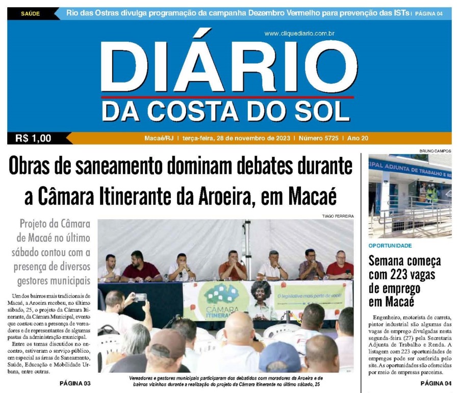Edições Impressas Edição de terça-feira 28/11/2023 nº 5725 Publicado em 28/11/2023 - 00:00 Escrito por Redação Notícias relacionadas: Seguinte Edição de quarta-feira 29/11/2023 nº 5726 Anterior Edição de sábado a segunda-feira 25 a 27/11/2023 nº 5724 Redação Notícias Recentes Cabo Frio6 horas atrás Agentes de Cabo Frio recebem novo treinamento técnico para atuar em casos de poluição sonora Cabo Frio6 horas atrás Homem procurado por latrocínio é detido por agentes em Cabo Frio Cabo Frio6 horas atrás Representante da Guarda Civil de Cabo Frio compete na etapa final ao lado de jovens atletas Polícia7 horas atrás Prefeito de Rio das Ostras volta de Brasília com esperança de novos investimentos Cidades7 horas atrás Campos publica 8ª convocação e chama 374 professores substitutos para a rede municipal Esporte7 horas atrás De Saquarema para o Brasileirão: Vasco troca gramado de São Januário Cidades7 horas atrás Quissamã inicia planejamento educacional para 2026 com foco em Educação Financeira Polícia10 horas atrás Mulher é presa na RJ-106, em Saquarema, com R$ 38 mil em drogas e arma Saúde11 horas atrás Silva Jardim tem aulão em alusão à campanha mundial do Novembro Azul Mobilidade11 horas atrás Mobilidade promove fiscalização para verificar situação de táxis em Rio das Ostras Clique Diário E. L. Mídia Editora Ltda CNPJ: 09.298.880/0001-07 Redação: Rua Tupinambás 122 Gloria – Macaé/RJ comercial@diariocs.com (22) 2765-7353 (22) 999253130 Mais lidas da semana Cultura12 horas atrás Adilson Lopes apresenta exposição “Trajetória” em Casimiro de Abreu Cidades3 dias atrás Servidores de Rio das Ostras participam de treinamento do Estado em Búzios Polícia3 dias atrás Farmácia é interditada e uma pessoa é presa em Rio das Ostras em operação da Polícia Federal Cidades2 dias atrás Vereadores de Macaé vão embarcar nesta quinta para participar da COP 30 em Belém