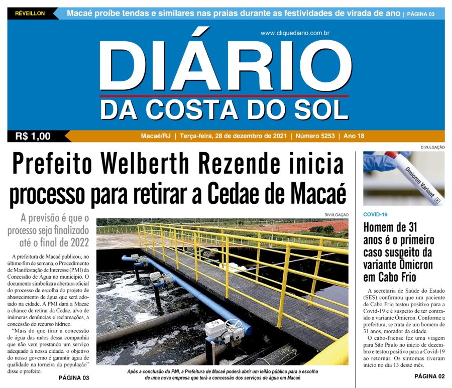 Edições Impressas Edição de terça-feira 28/12/2021 nº 5253 Publicado em 28/12/2021 - 00:01 Escrito por Fernando Vitor Notícias relacionadas: Seguinte Edição de quarta-feira 29/12/2021 nº 5254 Anterior Edição de sexta a segunda-feira 24 a 27/12/2021 nº 5252 Fernando Vitor Notícias Recentes Armação dos Búzios12 horas atrás Búzios atinge 80% de ocupação no feriado Cabo Frio13 horas atrás Cabo Frio prepara esquema especial de segurança nas praias e áreas de lazer Cabo Frio13 horas atrás Cabo Frio realiza ações de proteção a fauna após aparecimento de animais em bairros Cabo Frio14 horas atrás Cabo Frio reúne especialistas em evento do programa “Vim Cuidar de Você” Desenvolvimento14 horas atrás Rio das Ostras estreita relações com a Rede Petro BC de olho em eventos do setor de energia em 2026 Cabo Frio14 horas atrás Aula-passeio apresenta riqueza cultural e ambiental de Cabo Frio na Fazenda Campos Novos Cabo Frio14 horas atrás Cabo Frio suspende expediente em órgãos públicos nesta sexta Cidades14 horas atrás Macaé terá Dia do Futebol Feminino e programa para valorização da mulher rural Arraial do cabo14 horas atrás Carreta científica desembarca em Arraial do Cabo com programação gratuita Polícia14 horas atrás Polícia Civil prende liderança do ADA no bairro Fronteira em Macaé Clique Diário E. L. Mídia Editora Ltda CNPJ: 09.298.880/0001-07 Redação: Rua Tupinambás 122 Gloria – Macaé/RJ comercial@diariocs.com (22) 2765-7353 (22) 999253130 Mais lidas da semana Cultura6 dias atrás Adilson Lopes apresenta exposição “Trajetória” em Casimiro de Abreu Desenvolvimento14 horas atrás Rio das Ostras estreita relações com a Rede Petro BC de olho em eventos do setor de energia em 2026 Cidades3 dias atrás Macaé registra avanço na coleta seletiva porta a porta e recolhe mais de 2 toneladas em 45 dias Mobilidade6 dias atrás Mobilidade promove fiscalização para verificar situação de táxis em Rio das Ostras