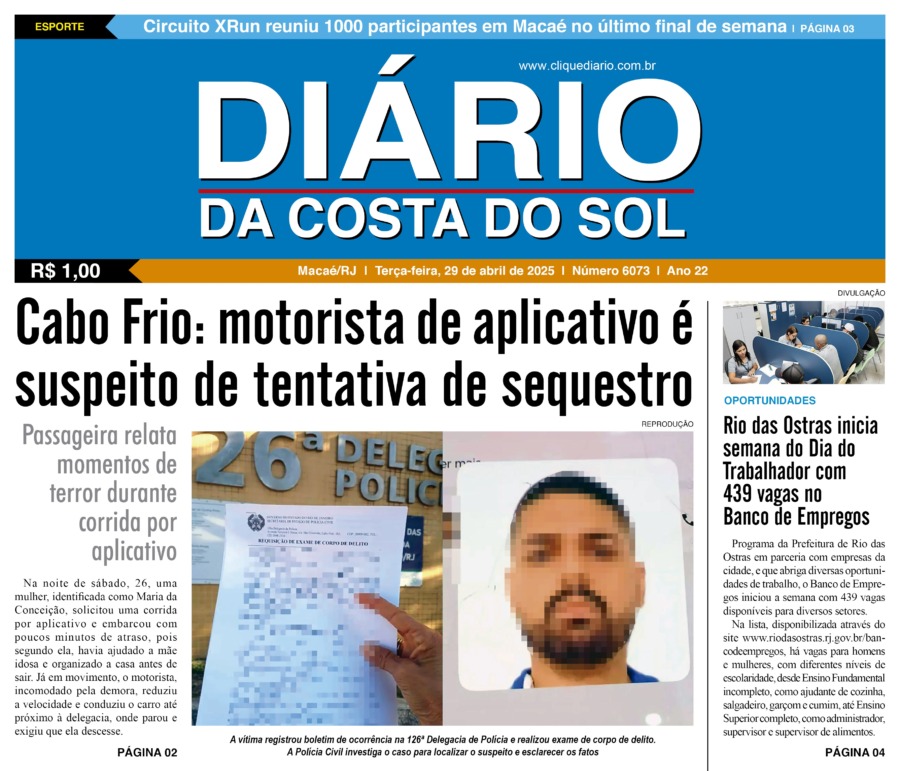 Edições Impressas Edição de terça-feira 29/04/2025 nº 6073 Publicado em 29/04/2025 - 08:43 Escrito por Redação Notícias relacionadas: Seguinte Edição de quarta-feira 30/04/2025 nº 6074 Anterior Edição de sábado a segunda-feira 26 a 28/04/2025 nº 6072 Redação Notícias Recentes Edições Impressas6 horas atrás Edição de sábado a segunda-feira 01 a 03/11/2025 nº 6203 Cidades7 horas atrás Macaé tem fim de semana repleto de competições esportivas Araruama23 horas atrás Expo Araruama 2025 promete fim de semana de música, cultura e sabor no Parque da Fazendinha Cabo Frio23 horas atrás Forças de segurança intensificam combate ao tráfico e prendem dupla de Cabo Frio Infraestrutura23 horas atrás Equipes de serviços públicos segue atuando em vários pontos de Rio das Ostras Arraial do cabo23 horas atrás Educação, inovação e meio ambiente se encontram na Arraial EXPO XP 2025 Cidades23 horas atrás Quissamã realiza entrega de certificados a visitadoras do Programa Criança Feliz Polícia23 horas atrás Foragido da Justiça é preso pela PM durante operação em Macaé Cultura23 horas atrás Nova temporada do Rio das Ostras Instrumental apresenta show de Nico Rezende Arraial do cabo24 horas atrás Prefeitura de Arraial distribui guia com pratos e harmonizações do Festival de Gastronomia e Chopp Clique Diário E. L. Mídia Editora Ltda CNPJ: 09.298.880/0001-07 Redação: Rua Tupinambás 122 Gloria – Macaé/RJ comercial@diariocs.com (22) 2765-7353 (22) 999253130 Mais lidas da semana Cidades3 dias atrás Silva Jardim tem evento do Outubro Rosa nessa quinta, 30, no Teatro Polícia5 dias atrás Polícia descobre esconderijo do tráfico e apreende grande quantidade de drogas em Macaé Cultura3 dias atrás Prédio da Onda, em Rio das Ostras, recebe oficina teatral gratuita a partir dessa quinta, 30 Arraial do cabo3 dias atrás Castração sem custo é retomada em Arraial do Cabo para controle populacional de gatos