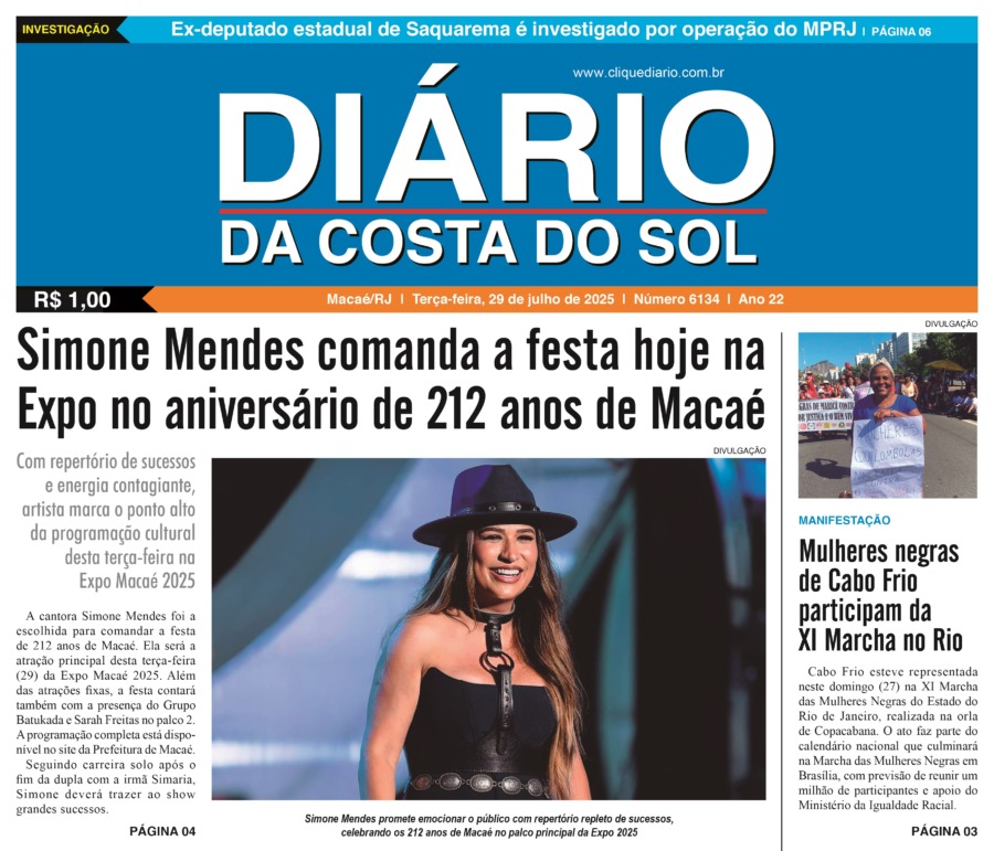 Edições Impressas Edição de terça-feira 29/07/2025 nº 6134 Publicado em 29/07/2025 - 09:32 Escrito por Redação Notícias relacionadas: Seguinte Edição de quarta-feira 30/07/2025 nº 6135 Anterior Edição de Sábado a segunda-feira 26 a 28/07/2025 nº 6133 Redação Notícias Recentes Cidades4 horas atrás Região serrana de Macaé recebe 1º X-Force Passeio de Quadriciclo e Aranha neste domingo (26) Polícia4 horas atrás Polícia apreende mais de meio quilo de drogas no Loteamento São João, em Rio das Ostras Saúde23 horas atrás Eventos esportivo e cultural reforça campanha do Outubro Rosa em Rio das Ostras nesse domingo, 26 Edições Impressas1 dia atrás Sábado a segunda-feira 25 a 27/10/2025 nº 6197 Cidades1 dia atrás Shopping Plaza Macaé oferece programação gratuita com feira de adoção e show de pagode neste fim de semana Cidades2 dias atrás 32º BPM completa 23 anos com solenidade de celebração e reconhecimento aos policiais Armação dos Búzios2 dias atrás Búzios celebra esporte e superação com XC RUN 2025 Araruama2 dias atrás Araruama promove saúde, lazer e cidadania em evento comunitário Arraial do cabo2 dias atrás Educação e sustentabilidade se encontram para jovens de Arraial do Cabo Cidades2 dias atrás Quissamã avança na reformulação do Currículo Municipal de Educação Clique Diário E. L. Mídia Editora Ltda CNPJ: 09.298.880/0001-07 Redação: Rua Tupinambás 122 Gloria – Macaé/RJ comercial@diariocs.com (22) 2765-7353 (22) 999253130 Mais lidas da semana Cultura6 dias atrás Silva Jardim anuncia shows gratuitos de samba e pagode para o fim de semana Cultura5 dias atrás Música, emoção e cores: Rodrigo Pontes apresenta show especial em Rio das Ostras Cabo Frio6 dias atrás Atletas de várias cidades se enfrentam em competição de Muay Thai em Cabo Frio Edições Impressas4 dias atrás Edição de quarta-feira 22/10/2025 nº 6195
