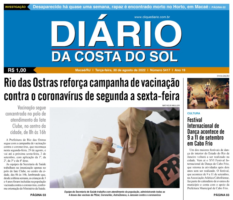 Edições Impressas Edição de terça-feira 30/08/2022 nº 5417 Publicado em 30/08/2022 - 01:58 Escrito por Fernando Vitor Notícias relacionadas: Seguinte Edição de quarta-feira 31/08/2022 nº 5418 Anterior Edição de sábado a segunda-feira 27 a 29/08/2022 nº 5416 Fernando Vitor Notícias Recentes Cultura3 minutos atrás Feriado da Consciência Negra tem programação em Rio das Ostras nessa quinta, 20 Cidadania31 minutos atrás Distrito de Casimiro de Abreu recebe Programa RJ para Todos, do governo estadual Cultura3 horas atrás Moda e Prosa Caipira tem sua 6ª edição nessa quinta, 20, em Saquarema Comércio4 horas atrás Rio das Ostras tem 19ª edição de sua tradicional feira outlet nesse feriado Cidades4 horas atrás Macaé recebe 20ª edição do Prefeitura Presente no dia 25 de novembro Polícia5 horas atrás Denúncia anônima leva à prisão de duas mulheres por tráfico em Macaé Cidades5 horas atrás Caravana de Natal Coca-Cola passa por Rio das Ostras e Casimiro de Abreu nessa quinta, 20 Edições Impressas7 horas atrás Edição de quarta-feira 19/11/2025 nº 6215 Arraial do cabo22 horas atrás Educação de Arraial do Cabo orienta responsáveis sobre rematrícula para o próximo ano Cabo Frio23 horas atrás Evento comercial mais aguardado de Cabo Frio atinge 100% de estandes vendidos Clique Diário E. L. Mídia Editora Ltda CNPJ: 09.298.880/0001-07 Redação: Rua Tupinambás 122 Gloria – Macaé/RJ comercial@diariocs.com (22) 2765-7353 (22) 999253130 Mais lidas da semana Cultura5 dias atrás Adilson Lopes apresenta exposição “Trajetória” em Casimiro de Abreu Cidades6 dias atrás Macaé é finalista no Festival Internacional de Cinema Cristão com “A Paixão de Cristo” Mobilidade5 dias atrás Mobilidade promove fiscalização para verificar situação de táxis em Rio das Ostras Cidades7 dias atrás Parceria com o Estado reforça prevenção de enchentes em Rio das Ostras há 39 dias do verão