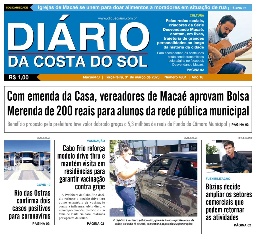 Edições Impressas Edição de terça-feira, 31/03/2020 nº 4831 Publicado em 31/03/2020 - 07:00 Escrito por Fernando Vitor Notícias relacionadas: Seguinte Edição de quarta-feira, 01/04/2020 nº 4832 Anterior Edição de Sáb a Seg, 28 a 30/03/2020 nº 4830 Fernando Vitor Notícias Recentes Polícia2 horas atrás Homem é preso em Maricá depois de matar uma pessoa a facadas nessa madrugada Polícia3 horas atrás Polícia Civil prende 3 homens por furto de mais de R$ 2 milhões em Rio das Ostras Polícia3 horas atrás Homem é preso por tráfico de drogas durante ação da Polícia Militar no Lagomar, em Macaé Polícia3 horas atrás Duas mulheres são presas por tráfico de drogas na Favela da Linha, em Macaé Polícia4 horas atrás Suspeito é flagrado com veículo adulterado e carga ilegal de cigarros na Barra de Macaé Oportunidade4 horas atrás Bando de Empregos de Rio das Ostras inicia novembro com mais de 600 vagas Cultura1 dia atrás Espetáculo “O Mágico de Oz” retorna aos palcos de Rio das Ostras nesse domingo, 2 Sem categoria1 dia atrás Macaé abre inscrições para a terceira edição da Semana Empreendedora Cidades2 dias atrás Rio das Ostras prepara cemitérios da cidade para o feriado de Finados nesse domingo, 2 Edições Impressas2 dias atrás Edição de sábado a segunda-feira 01 a 03/11/2025 nº 6203 Clique Diário E. L. Mídia Editora Ltda CNPJ: 09.298.880/0001-07 Redação: Rua Tupinambás 122 Gloria – Macaé/RJ comercial@diariocs.com (22) 2765-7353 (22) 999253130 Mais lidas da semana Cultura5 dias atrás Orange Sound faz tributo ao Kid Abelha nessa quinta, 30, no Teatro de Rio das Ostras Cultura5 dias atrás Prédio da Onda, em Rio das Ostras, recebe oficina teatral gratuita a partir dessa quinta, 30 Cidades5 dias atrás Silva Jardim tem evento do Outubro Rosa nessa quinta, 30, no Teatro Arraial do cabo5 dias atrás Castração sem custo é retomada em Arraial do Cabo para controle populacional de gatos