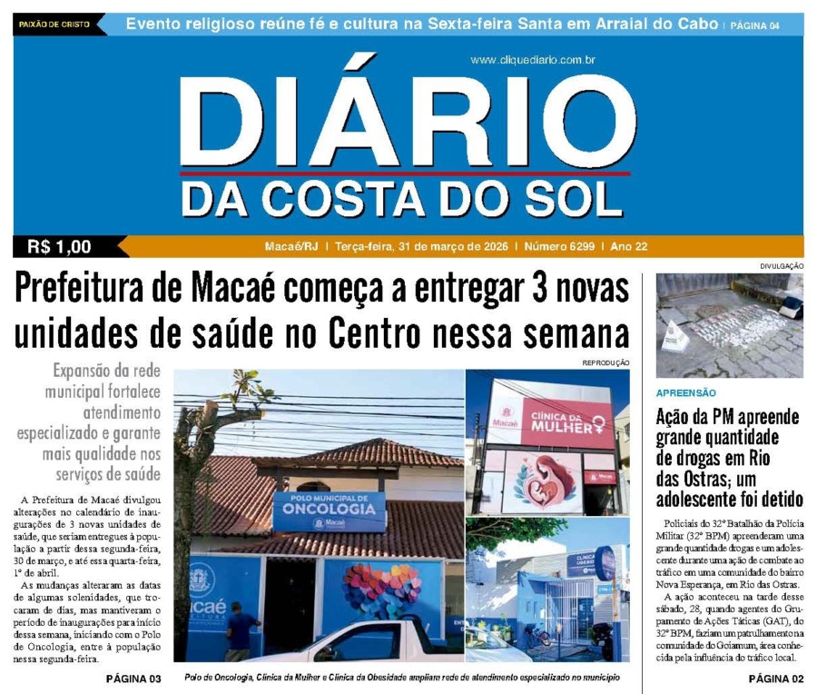 Edições Impressas Edição de terça-feira 31/03/2026 nº 6299 Publicado em 31/03/2026 - 10:22 Escrito por Redação Notícias relacionadas: Anterior Edição de sábado a segunda-feira, 28 a 30/03/2026 nº 6298 Redação Notícias Recentes Cidades34 minutos atrás Concurso público para área da Saúde em Macaé já tem inscrições abertas Saúde35 minutos atrás Novo Polo de Oncologia é inaugurado com solenidade no centro de Macaé Cidades38 minutos atrás Macaé confirma paralisação programada da ETA de Córrego do Ouro nessa quarta, 1º de abril Edições Impressas2 horas atrás Edição de terça-feira 31/03/2026 nº 6299 Cabo Frio19 horas atrás Funcionário é alvo de ataques preconceituosos durante expediente em Cabo Frio Armação dos Búzios19 horas atrás Búzios Sailing Week 2026 movimenta esporte e economia na Região dos Lagos Polícia20 horas atrás Polícia prende foragido da Justiça após alerta do sistema de monitoramento em Macaé Cabo Frio20 horas atrás Prefeitura de Cabo Frio detalha nova metodologia para taxa de coleta e promete correções Cabo Frio20 horas atrás Flagrante de possível furto a veículos mobiliza Guarda Municipal em Cabo Frio Comércio21 horas atrás Macaé prepara Mercado de Peixes para aumento do consumo na Semana Santa Clique Diário E. L. Mídia Editora Ltda CNPJ: 09.298.880/0001-07 Redação: Rua Tupinambás 122 Gloria – Macaé/RJ comercial@diariocs.com (22) 2765-7353 (22) 999253130 Mais lidas da semana Cidades6 dias atrás Câmara de Macaé sofre apagão durante debate com representantes da Enel Saúde4 dias atrás Nova Clínica da Mulher amplia atendimentos de saúde para as mulheres de Macaé Polícia2 dias atrás Polícia apreende drogas e mais de R$ 68 mil em comércio ligado ao tráfico em Rio das Ostras Polícia6 dias atrás Homem é preso pelo 32º BPM por descumprir medida protetiva em Macaé