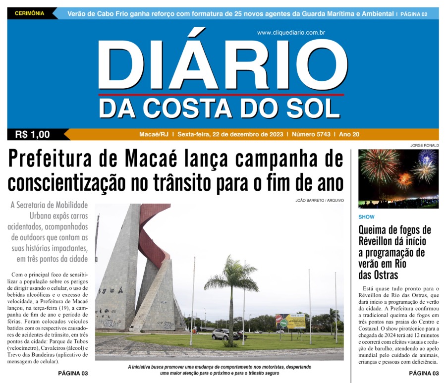 Edições Impressas Edição sexta-feira 22/12/2023 nº 5743 Publicado em 21/12/2023 - 23:55 Escrito por Redação Notícias relacionadas: Seguinte Edição de sábado a terça-feira 23 a 26/12/2023 nº 5744 Anterior Edição de quinta-feira 21/12/2023 nº 5742 Redação Notícias Recentes Cultura12 minutos atrás Festa do Feijão começa nessa sexta-feira, 21, em Cantagalo, em Rio das Ostras Cidades13 minutos atrás Quissamã celebra Consciência Negra com atividades culturais em escolas municipais Polícia27 minutos atrás Mulher é presa em Campos acusada de maus-tratos contra a própria filha Arraial do cabo46 minutos atrás Arraial do Cabo destaca cultura negra com apresentação de Luciana Mello e Mart’nália Arraial do cabo57 minutos atrás Arraial do Cabo inicia checagem obrigatória de veículos de passeio Esporte1 hora atrás Ex-levantadora da seleção brasileira de vôlei é destaque em torneio master em Saquarema Arraial do cabo2 horas atrás Arraial do Cabo amplia ações de equidade racial na saúde pública Arraial do cabo2 horas atrás Arraial do Cabo ajusta protocolos com a Marinha para ampliar segurança nas praias Cidades4 horas atrás Show de fogos, luzes e cores abre programação do Natal em Silva Jardim Polícia5 horas atrás Homem é preso em Rio das Ostras por conduzir moto sem capacete e sem CNH Clique Diário E. L. Mídia Editora Ltda CNPJ: 09.298.880/0001-07 Redação: Rua Tupinambás 122 Gloria – Macaé/RJ comercial@diariocs.com (22) 2765-7353 (22) 999253130 Mais lidas da semana Desenvolvimento2 dias atrás Rio das Ostras estreita relações com a Rede Petro BC de olho em eventos do setor de energia em 2026 Cabo Frio1 dia atrás Cabo Frio promove ação do projeto Capoeiragem para registro de documentário Cultura2 dias atrás Moda e Prosa Caipira tem sua 6ª edição nessa quinta, 20, em Saquarema Sem categoria1 dia atrás Cabo Frio recebe iniciativa que vai orientar Política Estadual do Empreendedorismo