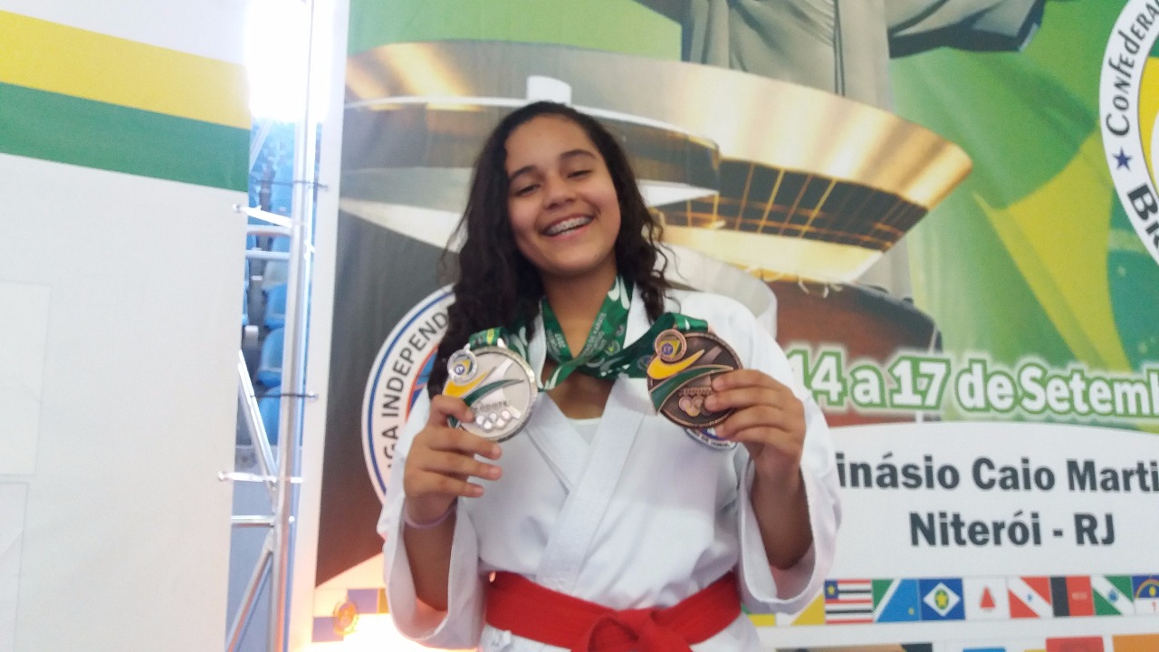 A atleta macaense Taís Menezes segue acumulando conquistas e feitos importantes no karatê. No último final de semana, ela disputou o Campeonato Brasileiro de Karatê 2017, realizado no Estádio Caio Martins, em Niterói. Na ocasião, a jovem faturou três medalhas, sendo uma de bronze no kata (espécie de luta imaginária), uma de prata no kumite individual (luta propriamente dita), além do ouro no kumite por equipe, representando a seleção carioca.