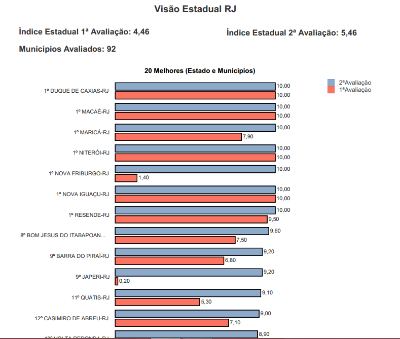 Macaé lidera o ranking com nota máxima, 10, mesma nota da última avaliação. Já Rio das Ostras perdeu pontos no ranking, caiu de 6,60 na primeira avaliação para 4,00 na segunda, e atualmente ocupa a posição de número 65.