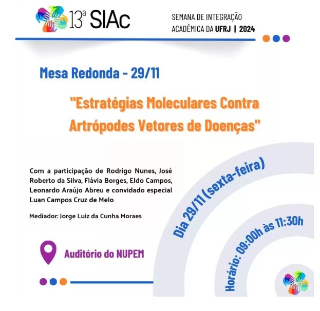 O Instituto de Biodiversidade e Sustentabilidade (NUPEM/UFRJ) promoverá nesta sexta-feira, 29 de novembro, a mesa-redonda intitulada “Estratégias Moleculares contra Artrópodes Vetores de Doenças”, como parte da Semana de Integração Acadêmica da Universidade Federal do Rio de Janeiro (UFRJ). O evento, com entrada gratuita, acontecerá no auditório do NUPEM/UFRJ, em Macaé, e reunirá renomados pesquisadores para discutir avanços científicos no controle de insetos e outros artrópodes que impactam a saúde pública e a qualidade de vida.