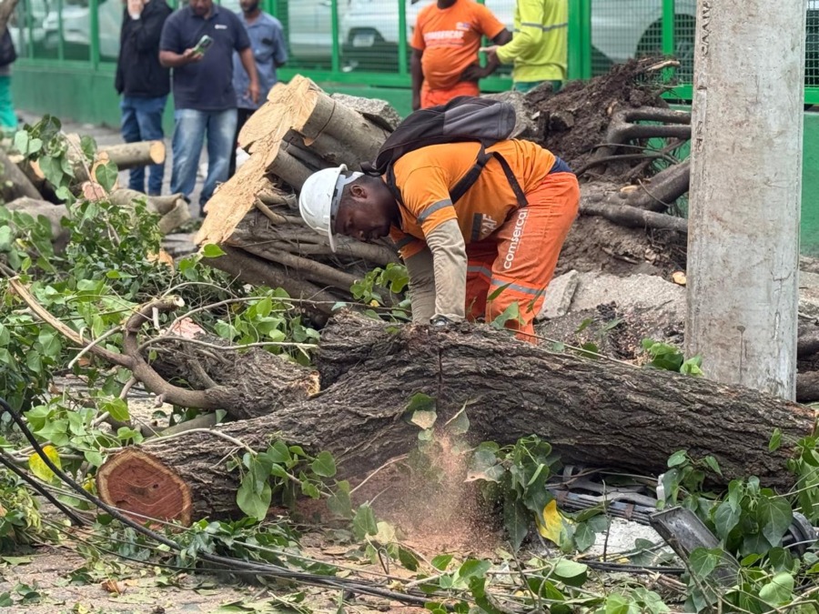 Na manhã de terça-feira (23), equipes da Comsercaf permaneceram no local para realizar a retirada da árvore e liberar o tráfego. O trabalho envolveu o uso de diferentes equipamentos, como serra elétrica, retroescavadeira e caminhão, além do suporte técnico necessário para remover galhos de grande porte e lidar com a fiação elétrica que foi afetada. O serviço exigiu atenção redobrada para garantir a segurança de quem circulava pelo entorno.