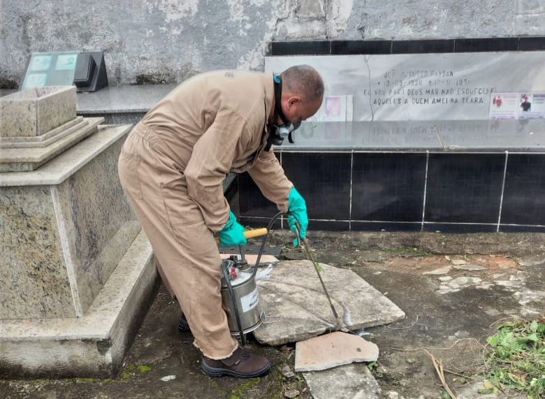 Nesta quarta-feira (30) uma equipe da Coordenadoria Especial de Vigilância Ambiental e Saúde (Cevas) da Secretaria de Saúde intensificou as ações contra vetores tanto biológicos quanto químicos nos cemitérios de Macaé. O gerente do órgão, Luan Campos, falou sobre a atuação da equipe nestes locais.