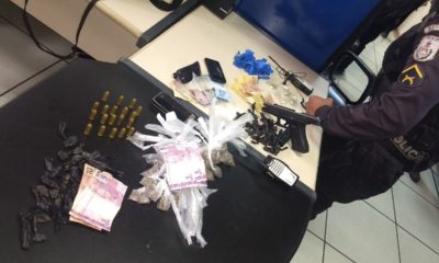 Com a dupla foram apreendidos uma pistola .40, 19 munições 71 sacolés de maconha, 53 sacolés de cocaína, quatro buchas de Skank e R$ 195 em espécie....