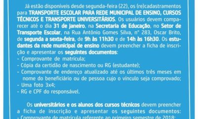Os usuários devem comparecer até o dia 31 de janeiro na Secretaria de Educação. Já estão disponíveis desde segunda-feira (22), o (re) cadastramento para transporte escolar...
