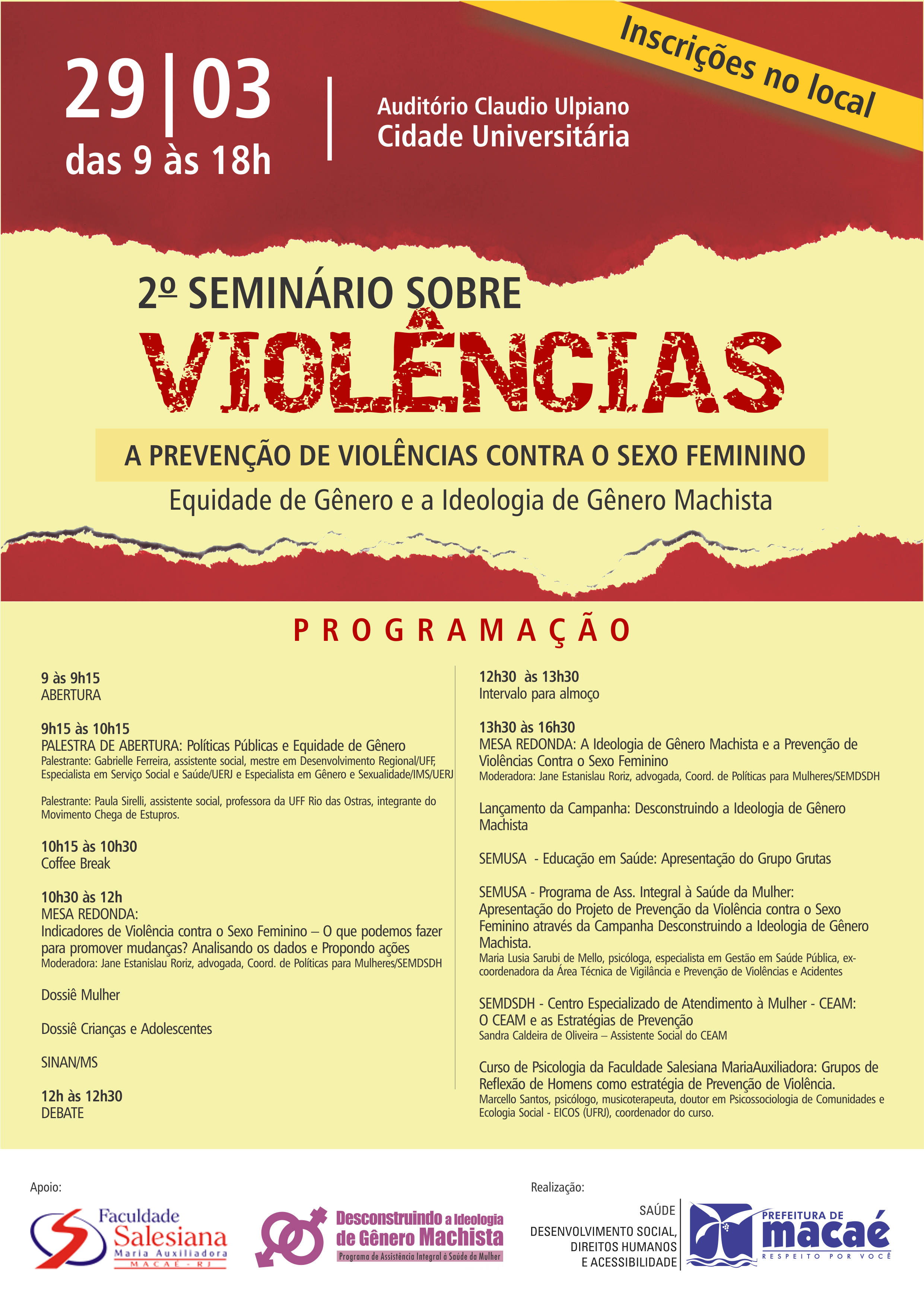 Com o intuito de promover o debate acerca das formas de violências que ocorrem diariamente com as mulheres em Macaé e em todo o país, a secretaria de Desenvolvimento Social do município promove nesta quarta-feira (29), o 2º Seminário Sobre Violências. O evento tem entrada gratuita e acontece de 9 às 18h, no Auditório Cláudio Ulpiano, na Cidade Universitária.