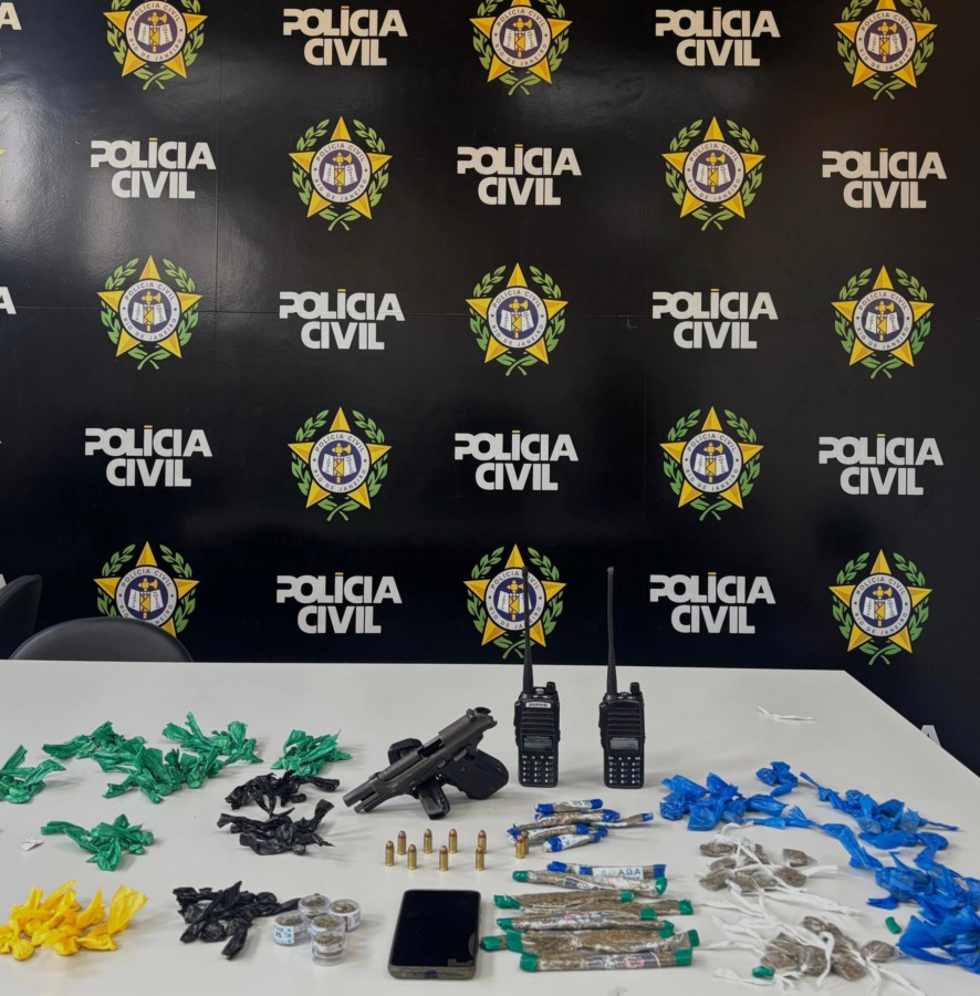 Com o adolescente, a polícia apreendeu uma pistola calibre 9 mm com numeração suprimida. Ela estava com oito projéteis intactos. Foram encontrados também dois rádios comunicadores na frequência do tráfico e uma sacola com 119 porções de pó branco e 89 embalagens de maconha.