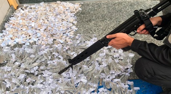 O adolescente levou os policiais até o esconderijo, onde foram localizados 60 pinos de cocaína. Depois, o suspeito encaminhou os militares para um terreno baldio onde estavam 470 pinos de cocaína e 700 buchas de maconha.