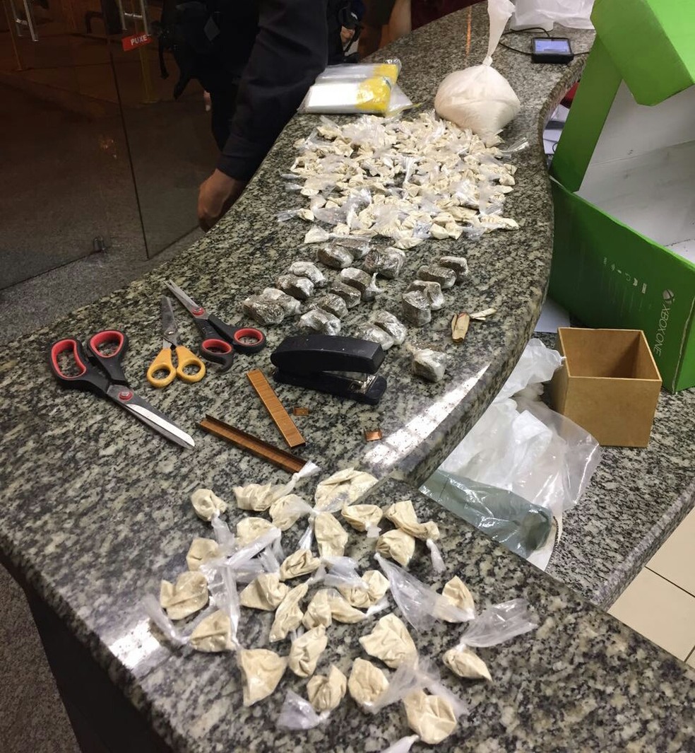 1,08 kg de cocaína, 130 gramas de maconha, três tesouras, um grampeador, além de materiais para endolação de drogas
