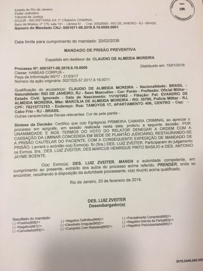 O mandado de prisão preventiva do ex-presidente da Comsercaf foi expedido pelo desembargador Luiz Zveiter e determina que Cláudio seja preso onde for encontrado.