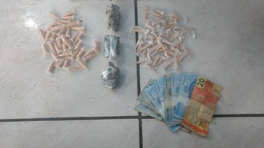 Na ação foram arrecadados 57 pinos de cocaína de R$ 10, 36 Pinos de cocaína de R$ 25, três bolas de maconha de 50 R$ e R$ 34 em espécie