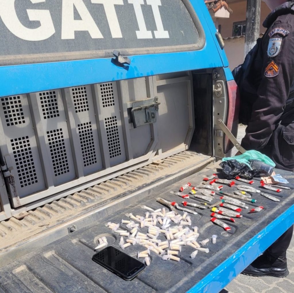 Com ele, os agentes encontraram parte das drogas. O mesmo confessou fazer parte do tráfico local e apontou onde estava escondido uma sacola com o restante do material. No total, foram apreendidas 38 tiras de maconha, 98 cápsulas de cocaína, R$ 22,00 em espécie, um celular e um rádio transmissor.