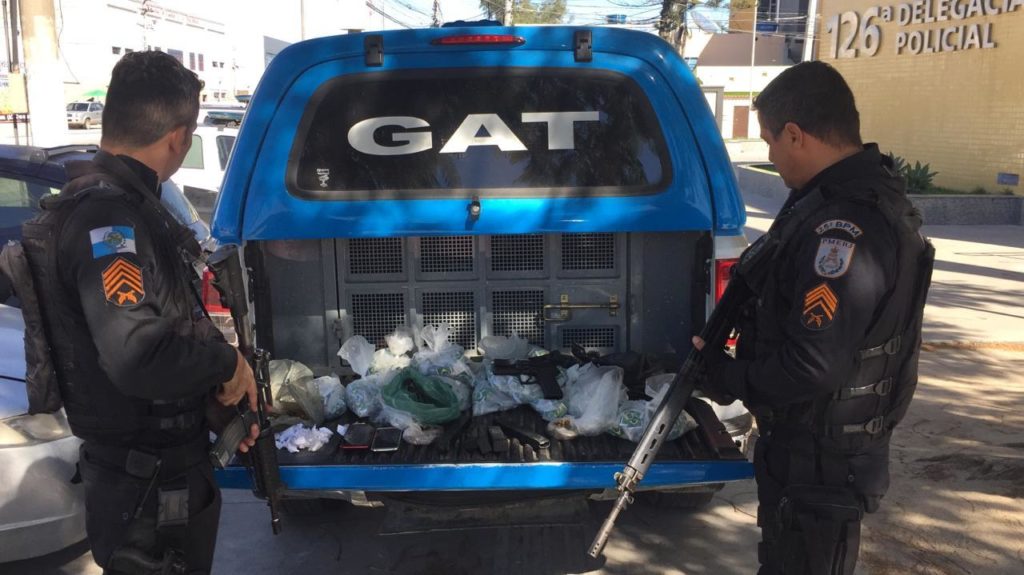 Elivelton Lima dos Santos Guimarães, vulgo “Benzema” e Alexsandro Malveiro Marciel, foram baleados durante uma troca de tiros com militares do Grupamento de Ações Táticas (GAT), na comunidade Rainha da Sucata, em Cabo Frio, durante a manhã. Após o cessar fogo, eles conseguiram fugir deixando para trás 1.685 cápsulas de cocaína, 215 munições, carregadores e uma pistola calibre 9mm.