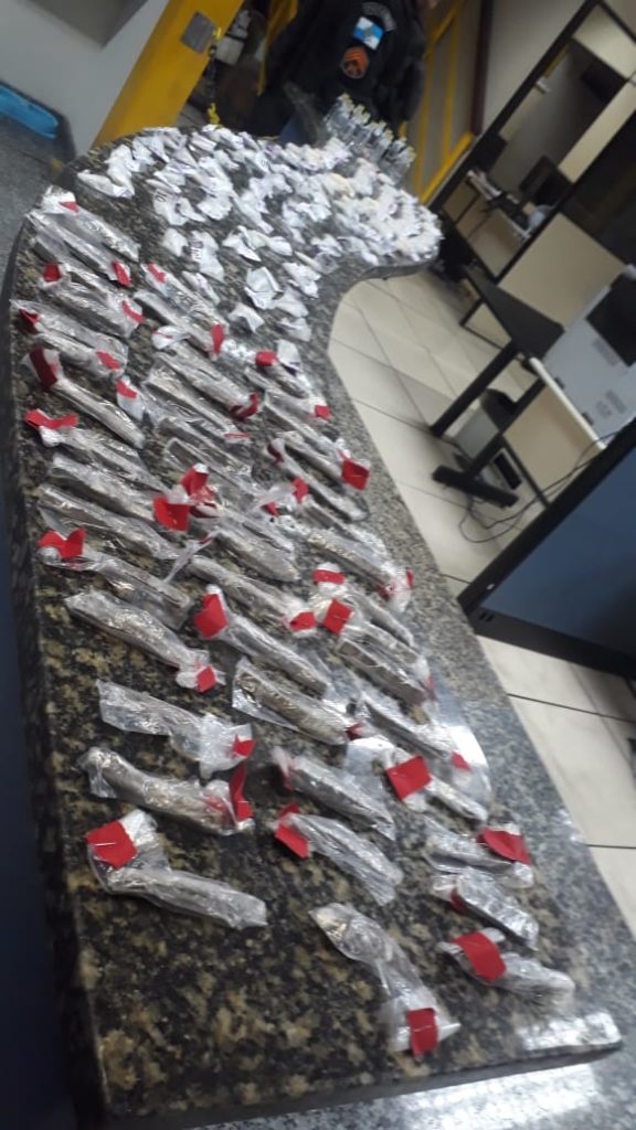Os dois menores tentaram fugir, mas foram contidos pelos policiais. Com eles foram encontrados 133 pinos de cocaína, 95 buchas de maconha, 13 frascos de lolo, além de dinheiro, aparelhos celulares e um rádio transmissor.