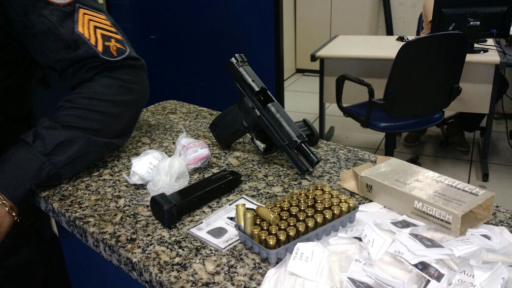 A polícia iniciou as buscas na região e avistou o suspeito, de 17 anos, na Rua E-9. Ele estava acompanhado de Alexandre da Silva Serrão, de 18 anos. Ao avistarem a viatura, os dois suspeitos foram para frente da janela de uma casa onde moradores conversavam na tentativa de despistar a polícia. A polícia revistou o local e encontrou com a dupla, 25 papelotes de cocaína, R$ 145, 00, oriundos da venda de drogas, um revólver calibre 38 com seis munições intactas, uma deflagrada e ainda onze munições escondidas em uma meia.
