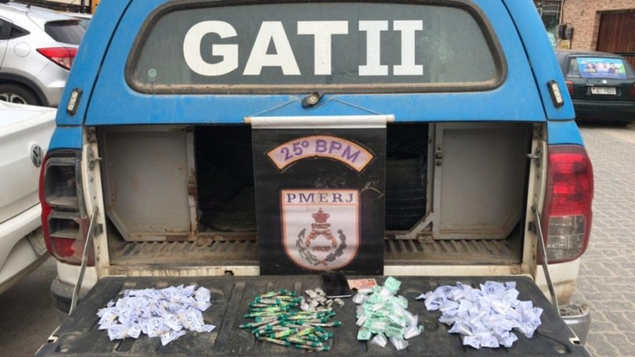 Dois elementos foram presos por tráfico de drogas, nesta quinta-feira (22), no Clube dos Engenheiros, em Araruama. De acordo com a Polícia Militar, uma equipe do GAT estava em patrulhamento quando avistou uma moto com dois ocupantes na Rua Mossoró.