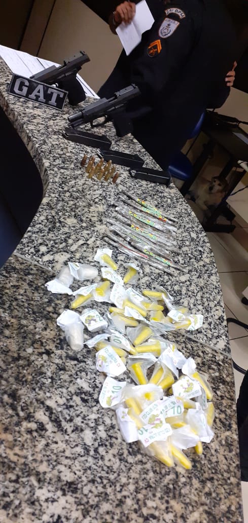 Na ação foram apreendidas duas pistolas calibre 9mm, munições, 42 pinos de cocaína e 14 buchas de maconha.