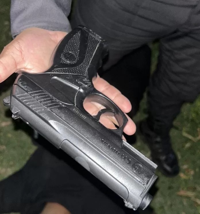 Por volta das 23h55, uma guarnição da Polícia Militar foi acionada para atender a uma ocorrência na Rua Uruguai, no bairro Aquárius, no distrito de Tamoios. Ao chegar ao local, os policiais conversaram com a vítima, um homem de 41 anos, que relatou ter sido abordado por dois indivíduos. Após realizar um patrulhamento na região, os militares localizaram os suspeitos, dois menores, de 16 anos. Com eles, foi encontrado um simulacro de pistola.