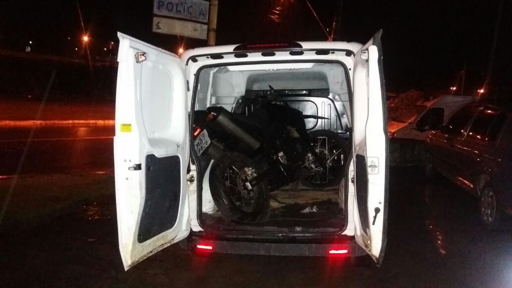 Suspeitos foram flagrados durante uma blitz transportando uma moto roubada no compartimento de carga de uma Fiat Fiorino.