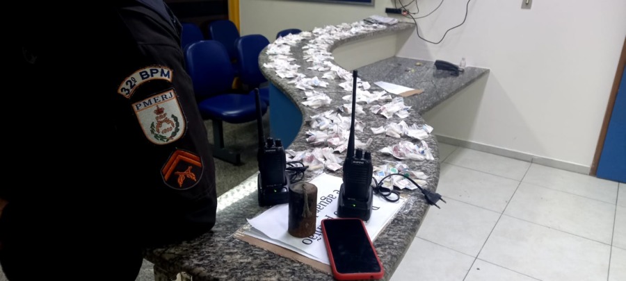 A dupla foi abordada e, com eles, os agentes apreenderam 63 pinos de cocaína, uma granada artesanal, dois rádios comunicadores, um aparelho celular e 285 pinos de cocaína.