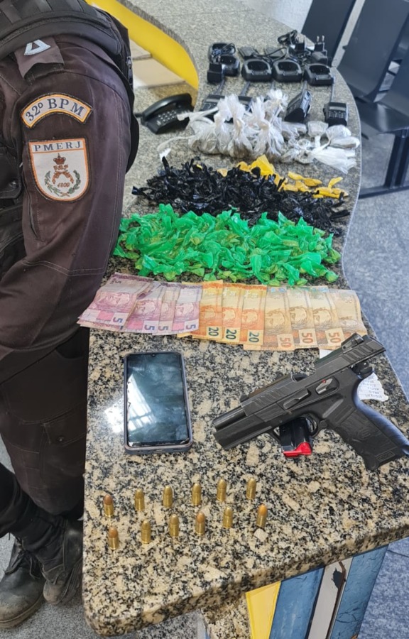 Segundo a Polícia Militar, os agentes realizavam uma diligência pela comunidade quando avistaram vários elementos em fuga. Após um cerco tático, os dois criminosos foram abordados com material entorpecente, rádios comunicadores, dinheiro e uma pistola.