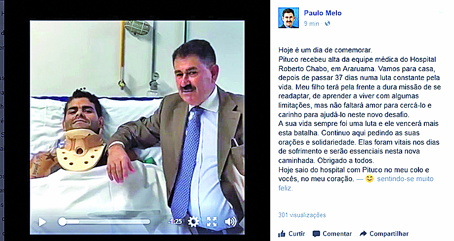O lutador de MMA Paulo César de Melo Sá Júnior, filho do deputado estadual Paulo Melo (PMDB), recebeu alta do Hospital Estadual Roberto Chabo, em Araruama, na Região dos Lagos do Rio, na manhã dessa terça-feira (16). Em um vídeo postado na rede social, ele e o pai agradeceram o apoio recebido durante os 37 dias de internação. Pituco, como é chamado, teve o braço esquerdo dilacerado no acidente de carro na RJ-106, em abril deste ano.