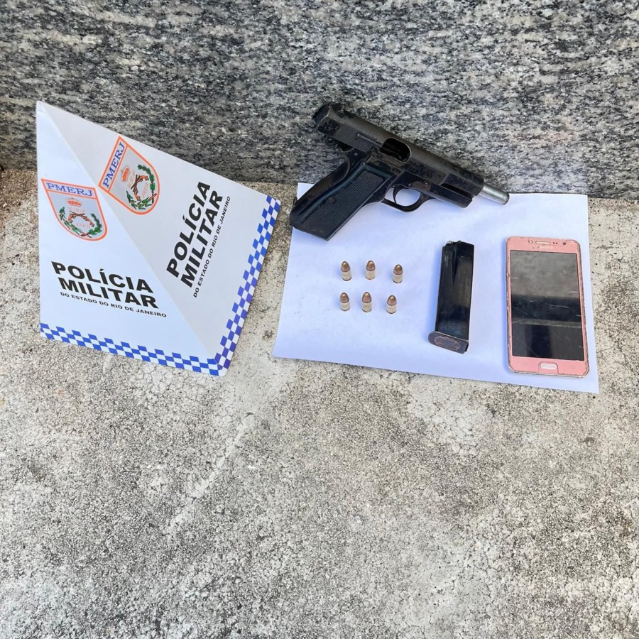 Com base nessas informações, a polícia montou uma operação na Estrada das Piabas, onde o acusado estava hospedado na residência de sua falecida mãe. Momentos depois ele foi capturado. Durante a diligência, a equipe apreendeu uma pistola calibre 9 mm com numeração suprimida, um carregador contendo seis munições do mesmo calibre e um celular.