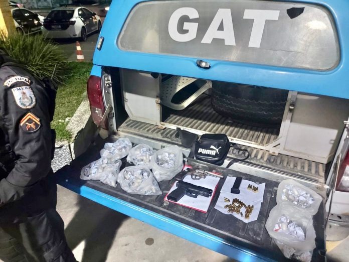 Durante a ação, foram apreendidos uma pistola calibre 9 mm, um revólver calibre 38, 33 munições, um carregador, 206 cápsulas de cocaína, 39 buchas de maconha, 53 pedras de crack e um aparelho celular.